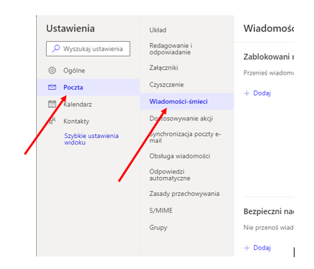W oknie Ustawienia, wybieramy kolejno opcje Poczta, a następnie Wiadomości-Śmieci.
