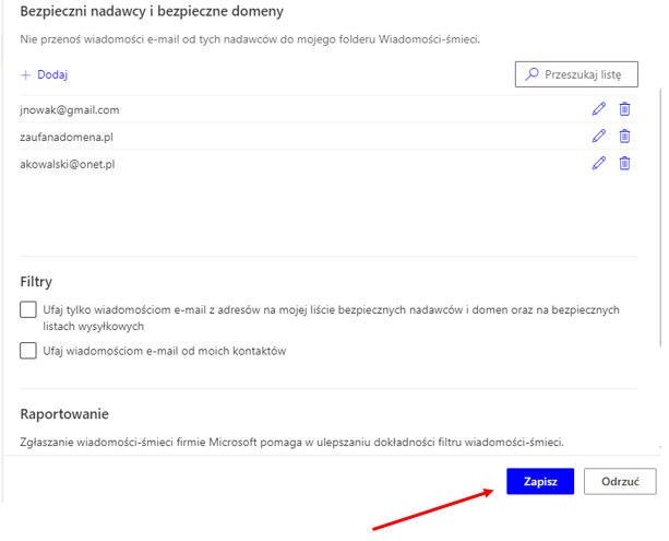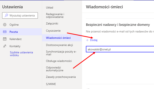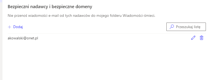 Przechodzimy do sekcji Bezpieczni nadawcy i bezpieczne domeny, gdzie możemy dodawać adresy e-mail i/lub domeny, które Outlook będzie traktował jako zaufane – wiadomości przysłane od takich nadawców lub od wszystkich nadawców z zaufanej domeny nie będą wpadały do folderu „Wiadomości-śmieci”.