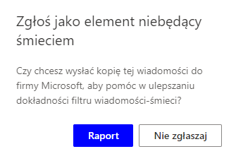 Na ekranie pojawi się kolejne okno, w którym możemy zdecydować, czy chcemy wysłać kopię otrzymanej wiadomości do firmy Microsoft, aby ulepszyć działanie filtrów antyspamowych – przycisk Raport lub rezygnujemy z takiej możliwości – przycisk Nie zgłaszaj.