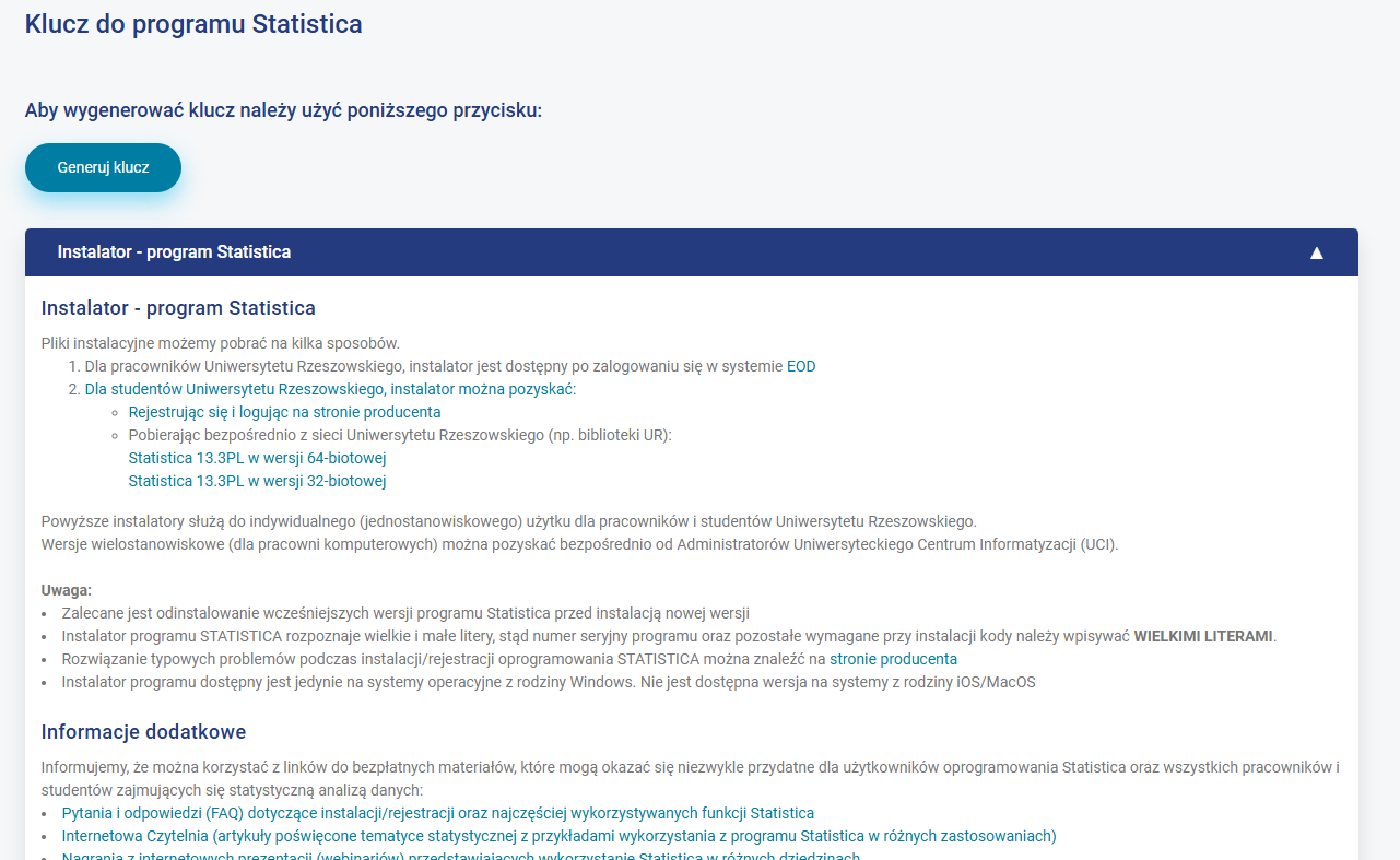 W celu uzyskania kluczy do oprogramowania Statistica należy zalogować się na swoje konto w systemie Wirtualna Uczelnia, który dostępny jest pod adresem https://wu.ur.edu.pl