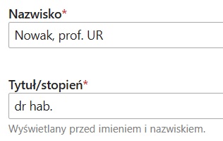 W przypadku posiadania tytułu "prof. UR", prosimy dopisać tytuł w polu "Nazwisko", a nie w polu "Tytuł/stopień":