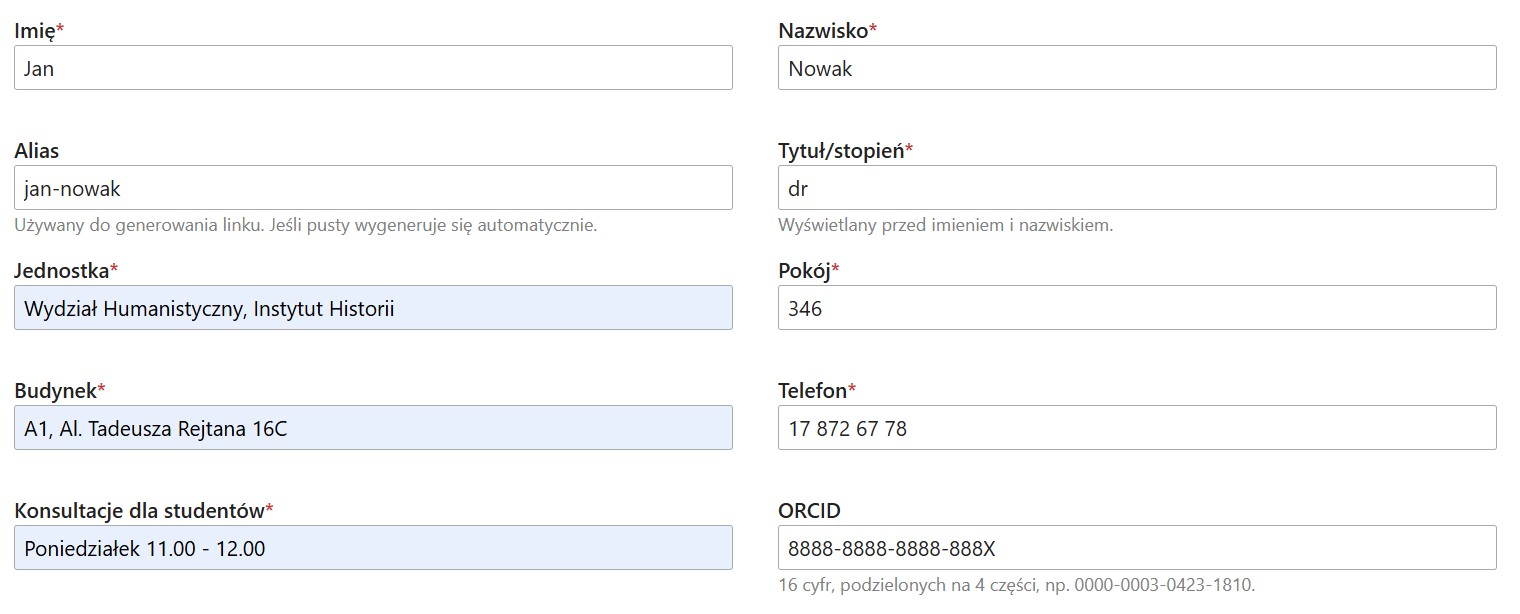 Dodatkowo każdy posiada możliwość uzupełnienia numeru ORCID, pola tekstowego oraz dodania linków.