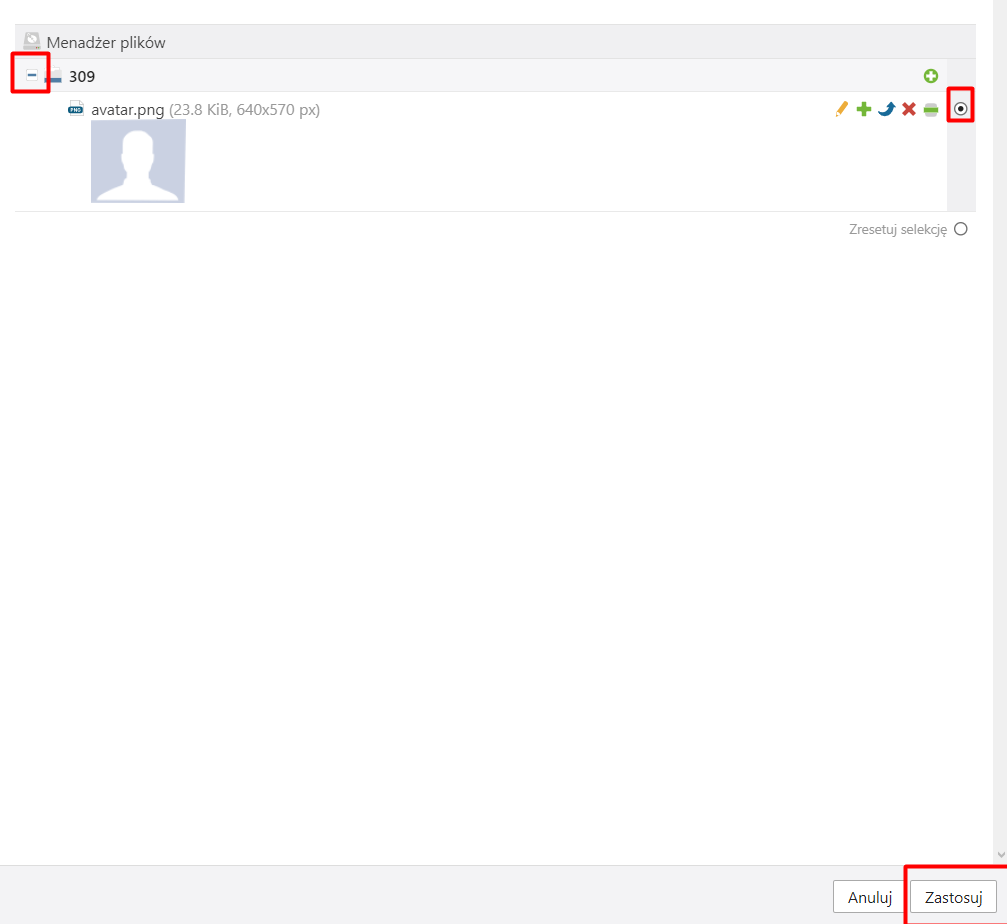 Następnie klikamy w ikonę plusa przy nazwie naszego katalogu (każdy użytkownik posiada swój indywidualny identyfikator, który jest jednocześnie nazwą katalogu). Zaznaczamy nasze zdjęcie klikając w białe kółko po prawej stronie. Ostatnią czynnością jest kliknięcie przycisku "Zastosuj" w prawym dolnym rogu okna: