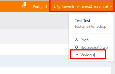 Aby wylogować się z systemu CMS należy skorzystać z opcji "Wyloguj" znajdującej się w prawym górnym rogu: