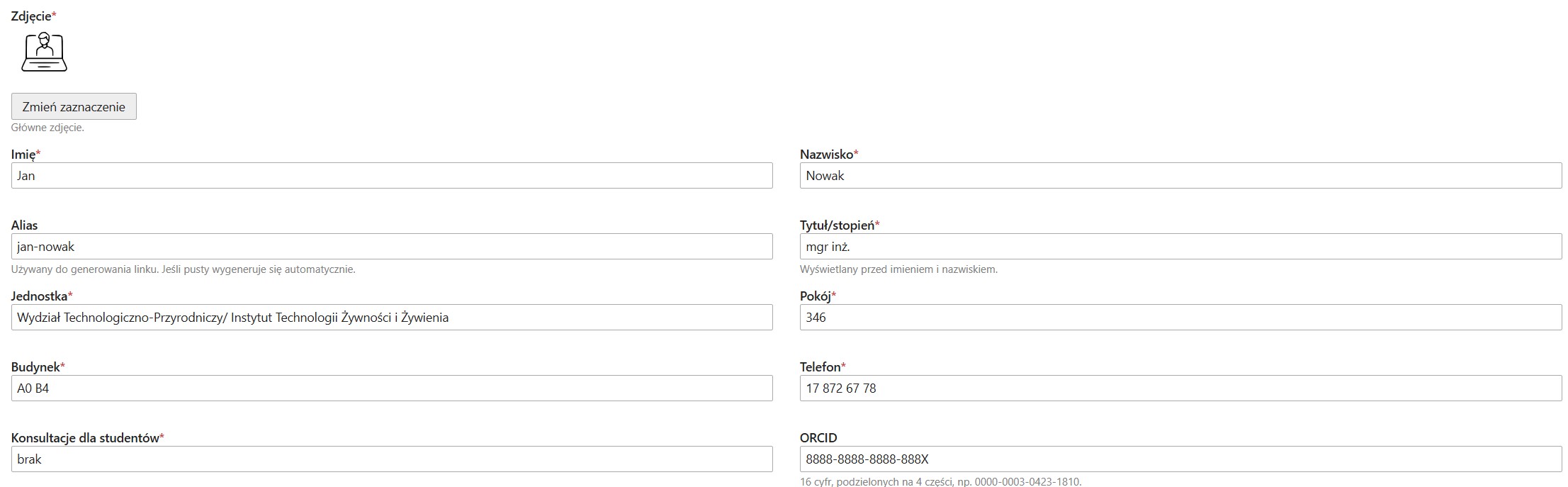 Oczywiście zarówno zdjęcie jak i wszystkie pozostałe pola można w dowolnym momencie edytować. W tym celu należy ponownie zalogować się do systemu, następnie dokonać edycji wybranych pól oraz zapisać dokonane zmiany.