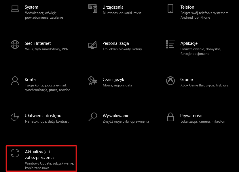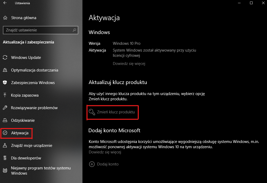 - Naciśnij przycisk Start -> Ustawienia -> Aktualizacje i zabezpieczenia -> Aktywacja -> Aktualizuj klucz produktu -> Zmień klucz produktu.