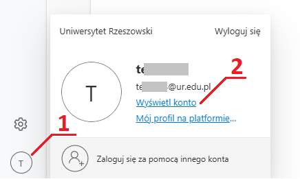 - Po zalogowaniu się w lewym dolnym rogu ekranu należy kliknąć na zdjęcie profilowe lub literę z inicjałem osoby, a następnie wybrać opcję „Wyświetl konto”.