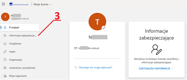 - b) Opcja „Telefon” pozwala na dodanie do konta Microsoft swojego numeru telefonu, na który będą przychodzić sms / połączenia w przypadku chęci zalogowania się na konto. Numer ten nie jest w żaden sposób przetwarzany w organizacji Uniwersytetu Rzeszowskiego i służy jedynie do weryfikacji konta podczas logowania.