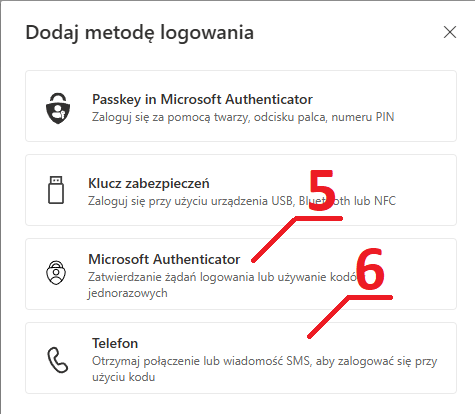 - Z dostępnych metod logowania, rekomendujemy „Microsoft Authenticator” lub „Telefon”.