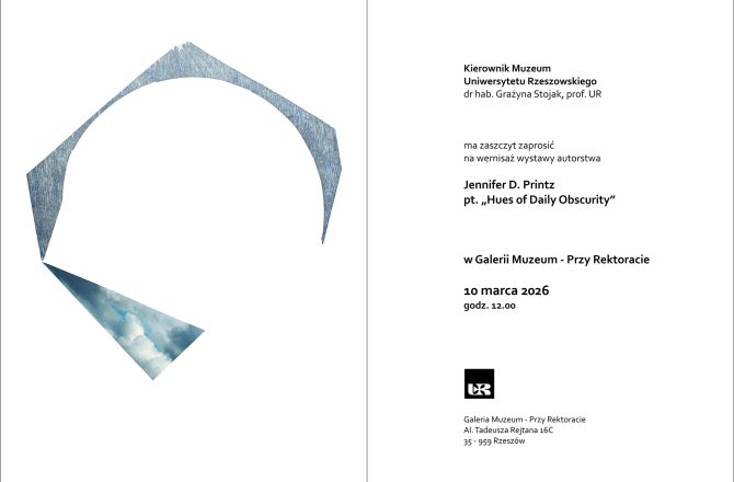 zobacz więcej Kierownik Muzeum UR prof. G. Stojak oraz Dziekan Wydziału Sztuk Pięknych prof. Ł. Cywicki, zapraszają na wernisaż wystawy aut. Jennifer D. Printz pt. „HUES OF DAILY OBSCURITY” w Galerii Muzeum przy Rektoracie 10/03/2026 r. godz. 12.00