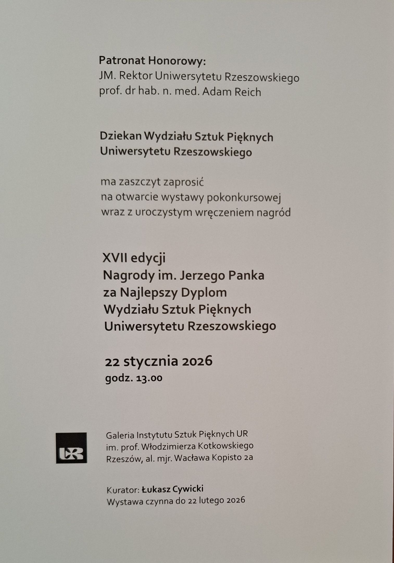 WYSTAWA POKONKURSOWA I UROCZYSTE WRĘCZENIE NAGRÓD XVII EDYCJI NAGRODY IM. JANA PANKA ZA NAJLEPSZY DYPLOM WYDZIAŁU SZTUK PIĘKNYCH UNIWERSYTETU RZESZOWSKIEGO