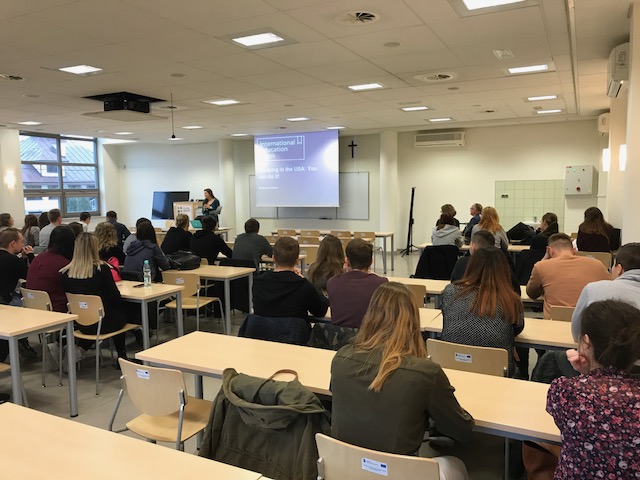 Na spotkaniu omówione zostały procedury przyjęcia na studia, wizy studenckie, stypendia oraz sposoby finansowania studiów w Stanach Zjednoczonych. Tydzień Edukacji Międzynarodowej jest wspólną inicjatywą Departamentu Stanu i Departamentu Edukacji U.S.A. mającą na celu promowanie programów, które przygotowują studentów amerykańskich do studiowania na świecie i zachęcają studentów z zagranicy do studiowania oraz wymiany doświadczeń w Stanach Zjednoczonych. W ramach tej inicjatywy organizowane są serie warsztatów, seminariów i spotkań, które mają na celu przybliżenie korzyści płynących z edukacji w U.S.A., wymiany akademickiej i ze współpracy w programach akademickich i zawodowych. Spotkanie przygotowała dr Marta Rzepecka (jest na opiekunką stażu stypendystki z U.S.A) z Uniwersyteckiego Centrum Nauki Języków Obcych