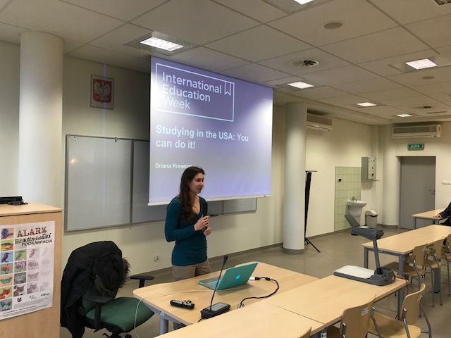 W dniu 29 listopada 2017 r. odbyło się spotkanie Pani Briany Krewson, stypendystki Polsko-Amerykańskiej Komisji Fulbrighta ze Stanów Zjednoczonych, ze studentami i pracownikami Centrum Języków Obcych Uniwersytetu Rzeszowskiego w ramach Tygodnia Edukacji Międzynarodowej. Podczas potkania Pani Krewson omówiła zasady rekrutacji i egzaminów wstępnych i opowiadała o życiu studenckim na amerykańskim miasteczku akademickim. Zachęcała do kontaktu z nią celem uzyskania bardziej szczegółowych informacji dotyczących procesu rekrutacyjnego.