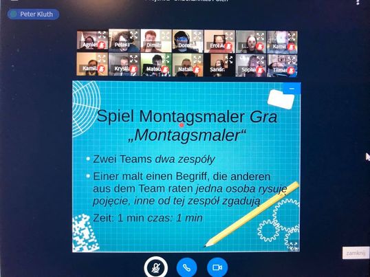 Odbyły się również spotkania online całego zespołu polsko-niemieckiego, podczas których graliśmy w przeróżne gry i spędzaliśmy miło czas śmiejąc się i żartując. Nauczyciele OS i wykładowcy UR robili wszystko, aby ta wymiana była wyjątkowa i utkwiła nam w pamięci. Jeden wieczór został zorganizowany przez kolegiatów, graliśmy m.in w państwa-miasta oraz czytaliśmy „Zungenbrecher” - czyli niemieckie łamacze językowe jak np. „Die Katzen kratzen im Katzenkasten, im Katzenkasten kratzen Katzen” Kolejne spotkanie zorganizowali studenci UR. Również nie zabrakło przeróżnych gier, które łączyły w sobie wzajemne poznanie się przez zabawę i naukę.