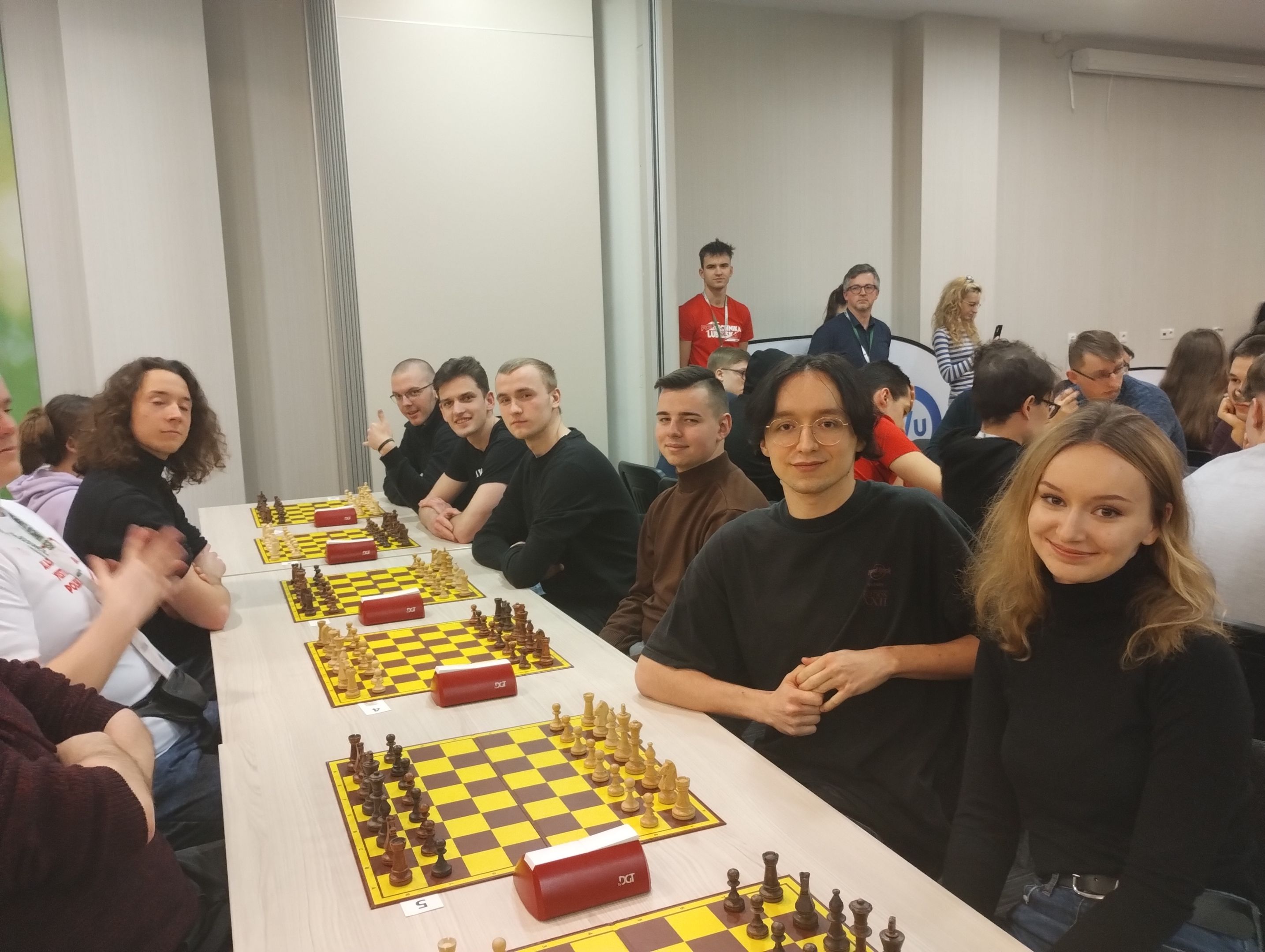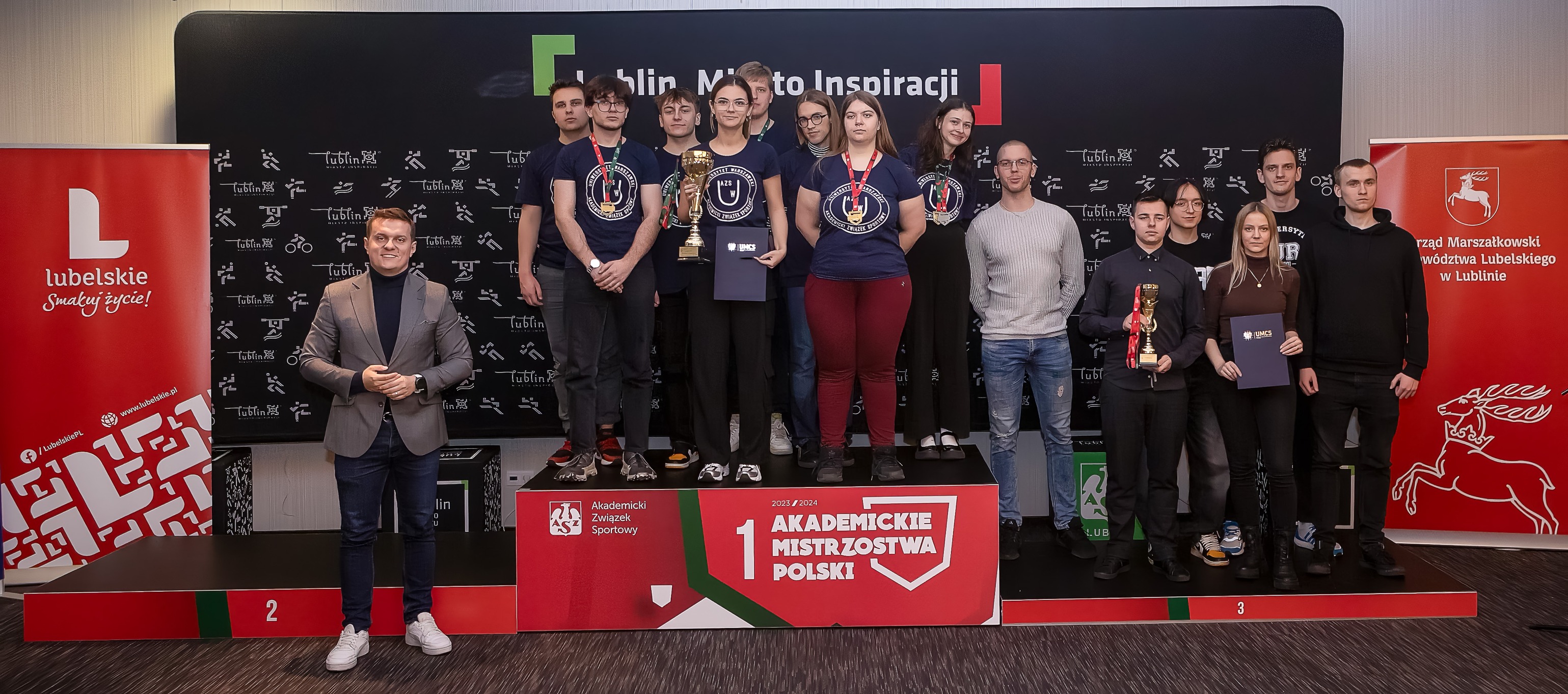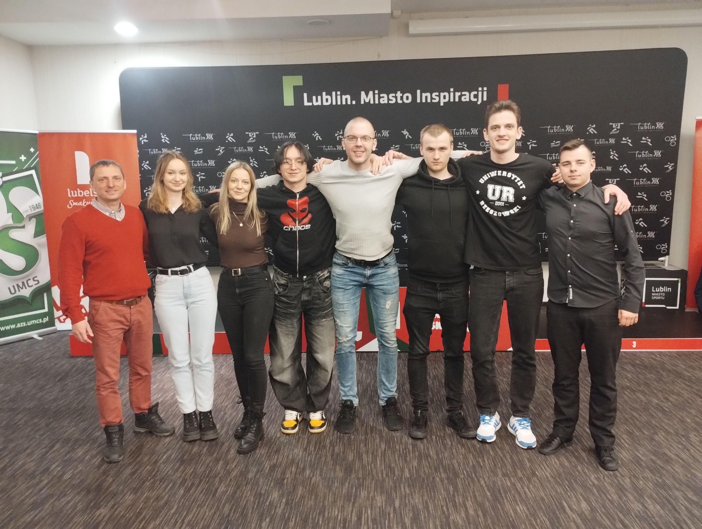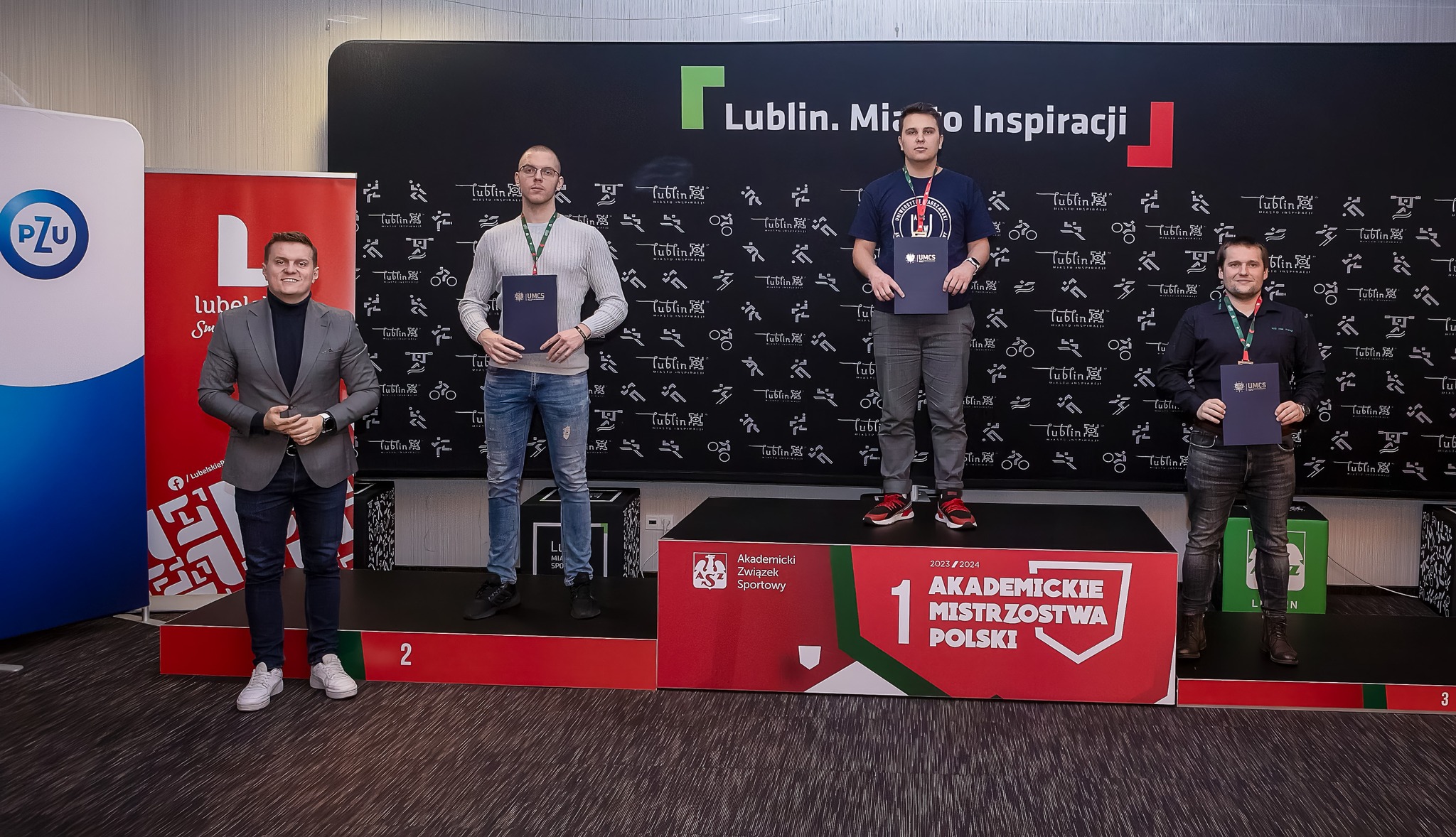 To pierwsze finały Akademickich Mistrzostw Polski w bieżącym roku 2023/2024. Do mistrzostw przystąpiło łącznie 386 uczestników, z 49 uczelni. Już w pierwszej konkurencji student Uniwersytetu Rzeszowskiego zdobył medal. To Miłosz Szpar, który w ostatniej dziewiątej rundzie walczył do ostatnich sekund o tytuł Mistrza w klasyfikacji generalnej. Niestety poniósł porażkę, która ściągnęła go na piąte miejsce. W klasyfikacji Uniwersytetów był jednak drugi i zdobył srebrny medal. W turnieju indywidualnym z bardzo dobrej strony pokazała się Barbara Trybowska, która była piąta w klasyfikacji Uniwersytetów. Kolejnym etapem imprezy był turniej drużynowy. Nie układał się on po myśli naszych zawodników, po kolejnych rundach spadali do drugiej dziesiątki, a nawet niżej. Ostatecznie jednak drużyna w składzie: Miłosz Szpar, Adrian Miąsik. Piotr Sygulski, Wojciech Urbański, Michał Drożdzal, Barbara Trybowska, Agnieszka Łuka i Miłosz Szczudło zajęła czwarte miejsce w pionie Uniwersytetów. Po zliczeniu punktów w turnieju indywidualnym oraz drużynowym udało się prześcignąć Uniwersytet Gdański i drugi już raz cieszyć się z brązowych medali. W klasyfikacji generalnej drużyna uplasowała się na bardzo wysokim ósmym miejscu. Serdecznie gratulujemy całej drużynie.