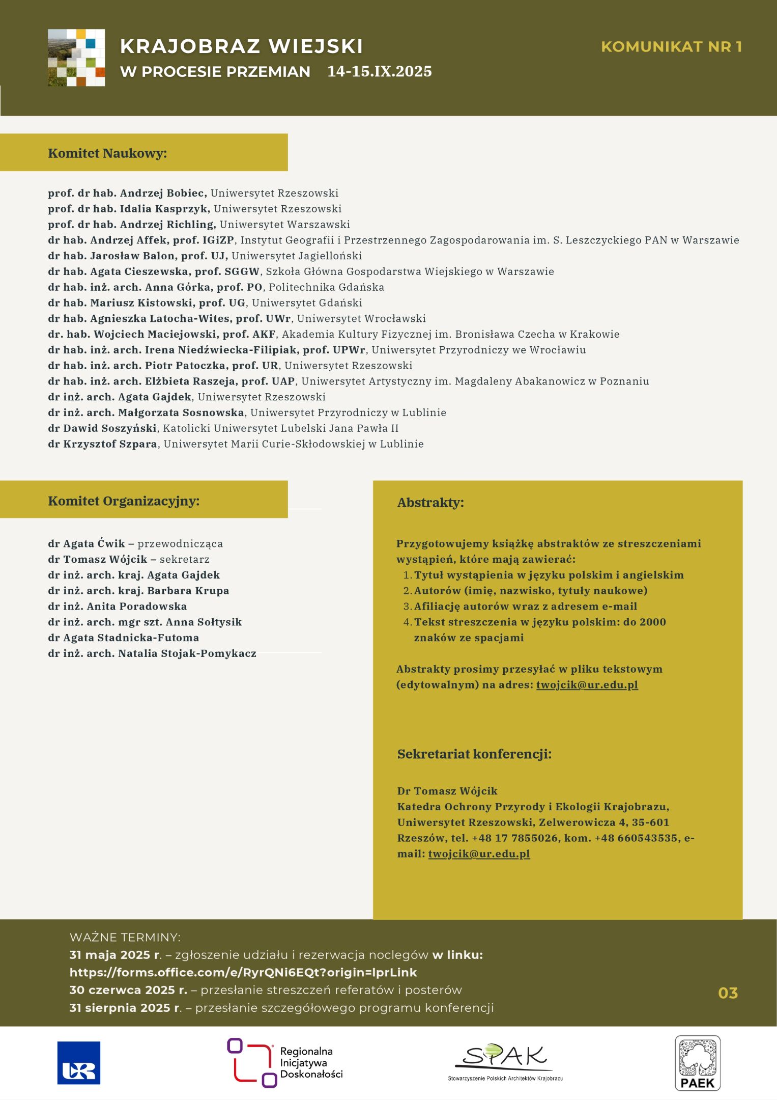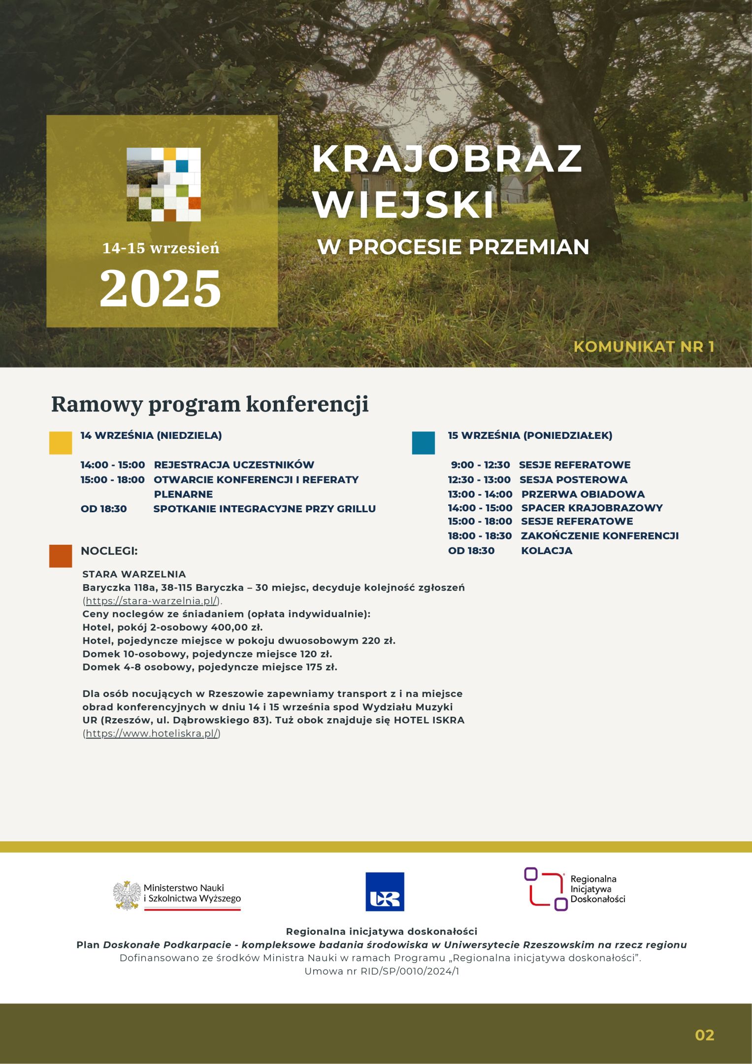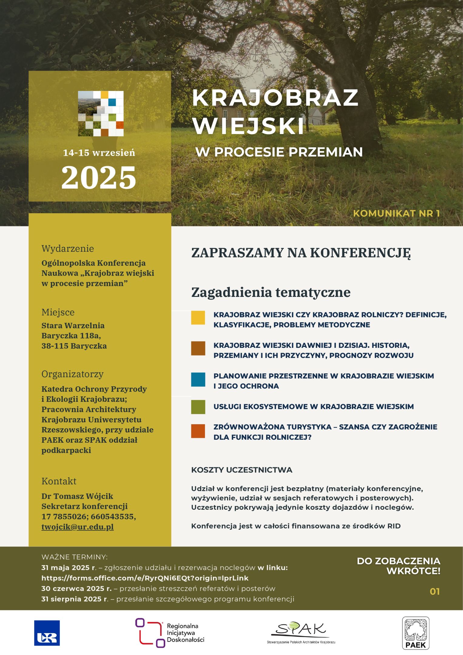 W imieniu Komitetu Organizacyjnego Ogólnopolskiej Konferencji Naukowej pt. „Krajobraz wiejski w procesie przemian”, organizowanej w dniach 14-15 września 2025 roku w Baryczce koło Rzeszowa, chcielibyśmy serdecznie Państwa zaprosić do udziału w tym wydarzeniu.