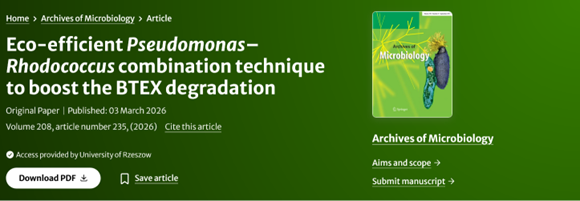 W czasopiśmie Archives of Microbiology ukazała się publikacja zatytułowana „Eco-efficient Pseudomonas–Rhodococcus combination technique to boost the BTEX degradation”, która jest efektem współpracy dr hab. Ewy Szpyrki oraz dr Magdaleny Podbielskiej z prof. M. Russel z Uniwersytetu Technologicznego w Dalian, Chiny.