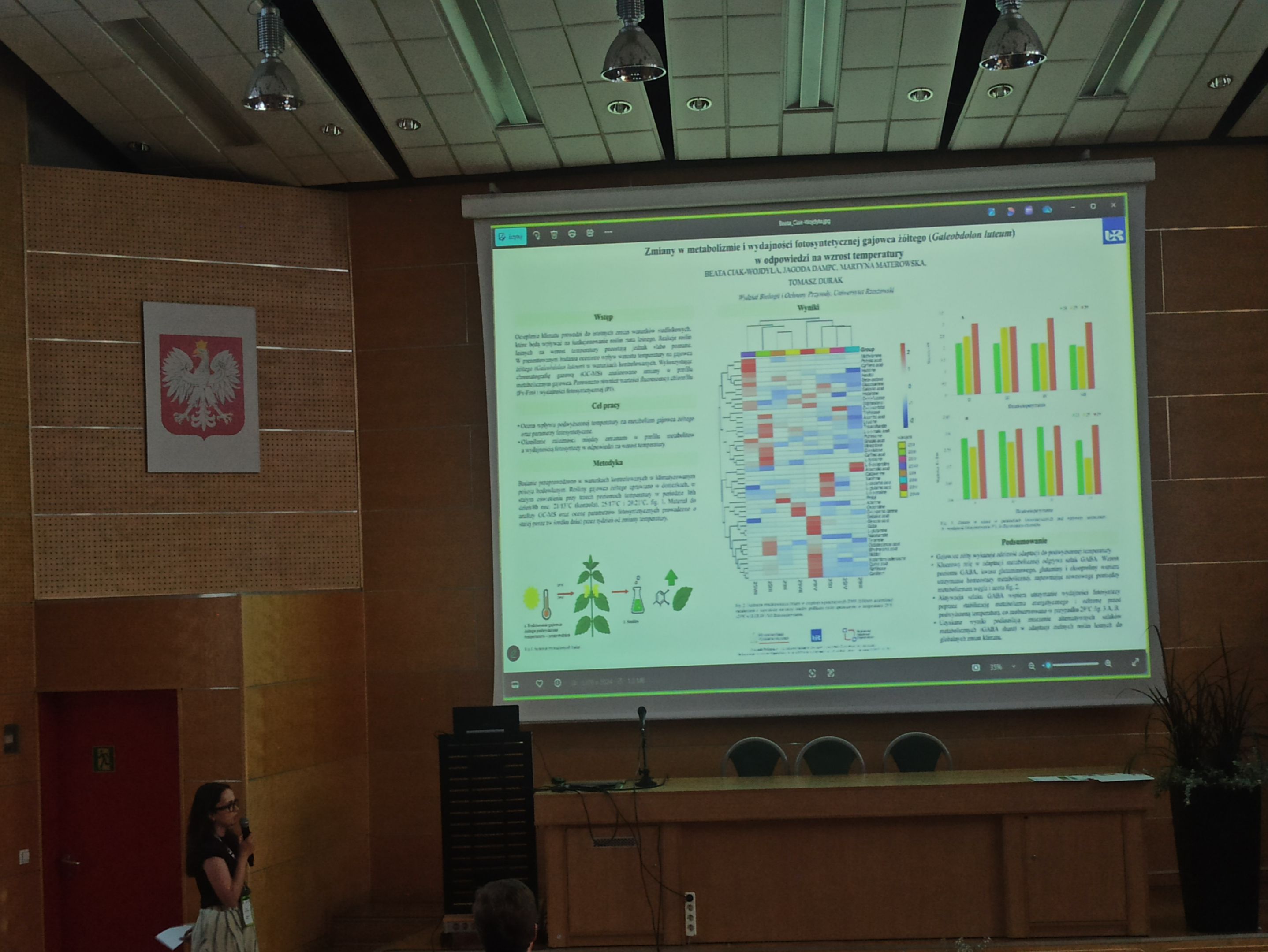 Podczas Zjazdu Pani mgr Beata Ciak-Wojdyła przedstawiła poster pt. „Zmiany w metabolizmie i wydajności fotosyntetycznej gajowca żółtego (Galeobdolon luteum) w odpowiedzi na wzrost temperatury”. Prezentowane badania są efektem pracy zespołu kierowanego przez dr hab. Tomasza Duraka, prof. UR, skoncentrowanej na badaniu ekologicznej i biochemicznej odpowiedzi roślin leśnych na wzrost temperatury. Współautorami prezentacji byli również: mgr Jagoda Dampc, mgr Martyna Materowska.
