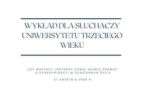 W dniu 21 kwietnia 2026 r. Rzecznik akademicki dr Katarzyna Szwed wygłosiła dla słuchaczy Uniwersytetu Trzeciego Wieku wykład pt. „Czy wszyscy jesteśmy równi wobec prawa? O dyskryminacji w codziennym życiu”.