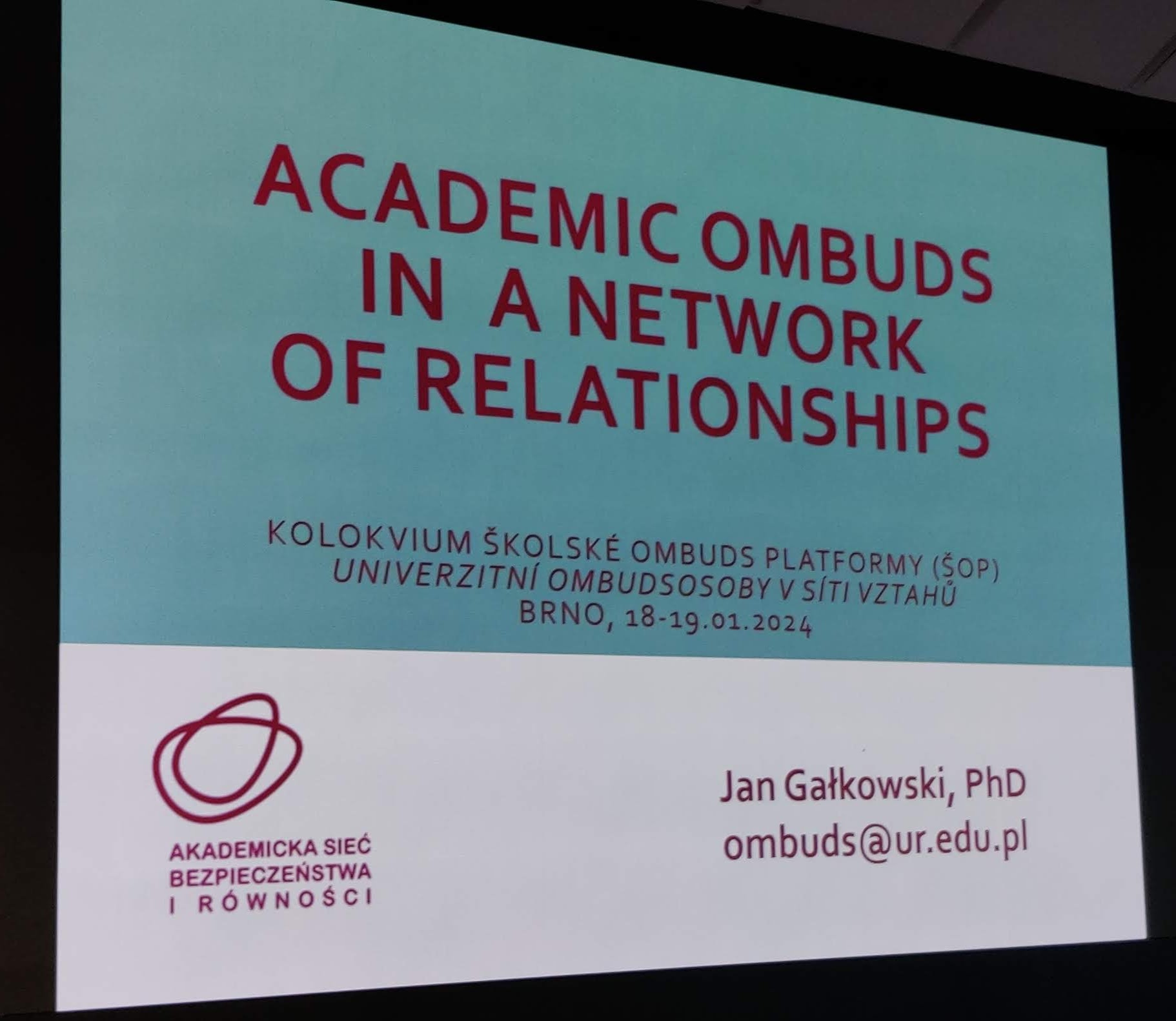 Liczba rzeczników akademickich w Republice Czeskiej znacząco wzrosła w ostatnich latach, ale wspólne działania zaczęli oni dopiero niedawno, a ich stowarzyszenie zostało formalnie zarejestrowane zaledwie w grudniu 2023. Młoda czeska organizacja rzeczników szukając wzorów dla swojego działania sięga m.in. po wzorce z Polski. Dlatego właśnie gościem specjalnym zjazdu ŠOP, jedynym spoza Republiki Czeskiej, był dr Jan Gałkowski, rzecznik akademicki UR, a zarazem sekretarz zarządu ASBiR. Dr Gałkowski w swoim wystąpieniu „Academic ombuds in a network of relationships” mówił o swoich doświadczeniach pracy rzecznika w Uniwersytecie Rzeszowskim oraz o współpracy polskich rzeczników.