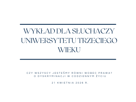 W dniu 21 kwietnia 2026 r. Rzecznik akademicki dr Katarzyna Szwed wygłosiła dla słuchaczy Uniwersytetu Trzeciego Wieku wykład pt. „Czy wszyscy jesteśmy równi wobec prawa? O dyskryminacji w codziennym życiu”.