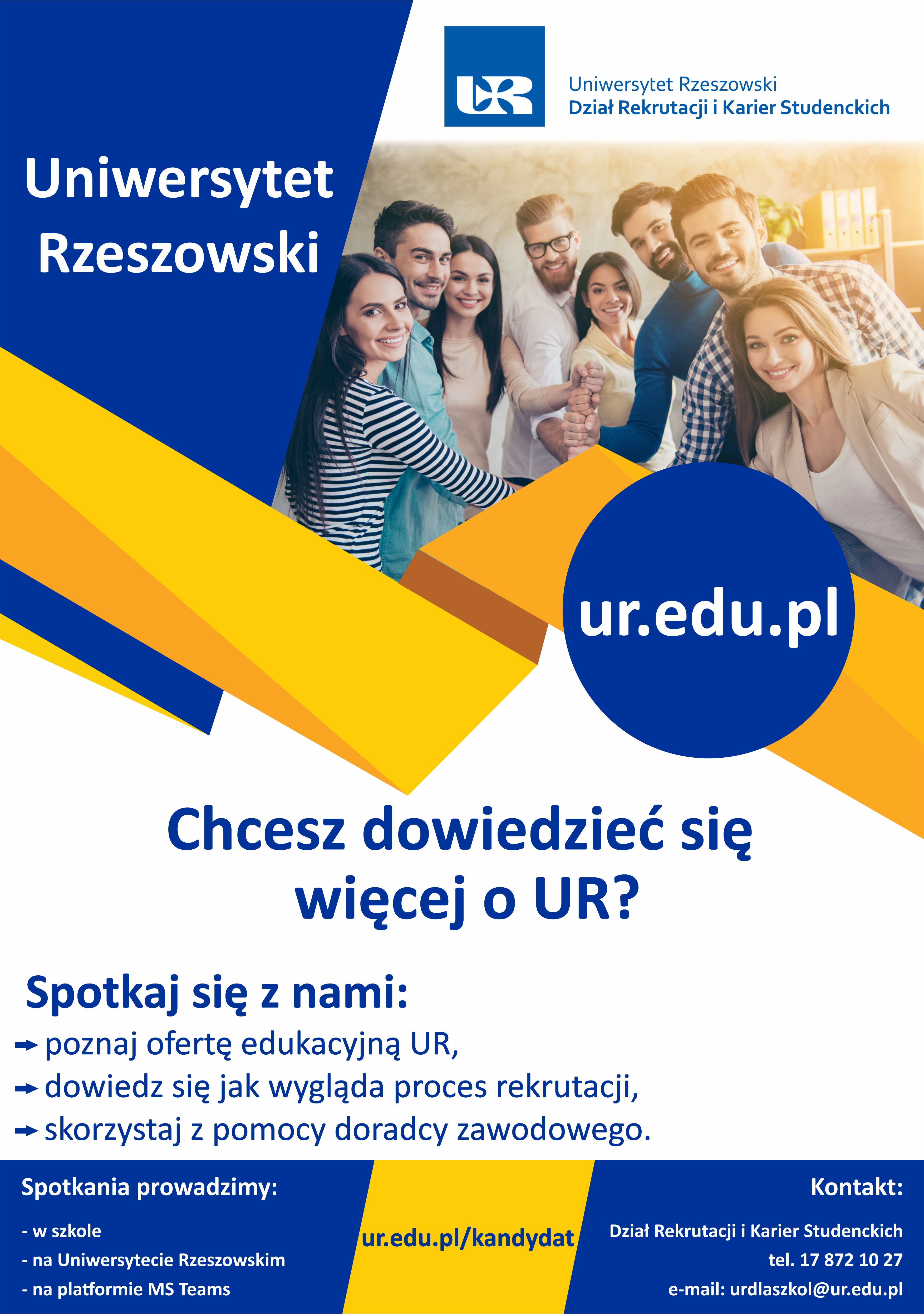 - spotkania z młodzieżą – w szkole bądź na terenie Uniwersytetu Rzeszowskiego lub poprzez platformę MS TEAMS, celem zaprezentowania dydaktycznej oferty Uczelni: kierunków studiów, zasad rekrutacji, informacji o możliwości otrzymania stypendiów i miejsc w domach studenckich, a ponadto działalności kół naukowych i organizacji studenckich. Młodzież będzie mogła zwiedzić wybrane obiekty UR i wziąć udział w pokazach przygotowanych przez naszych studentów, pracowników kolegiów, członków kół naukowych lub organizacji studenckich;