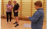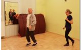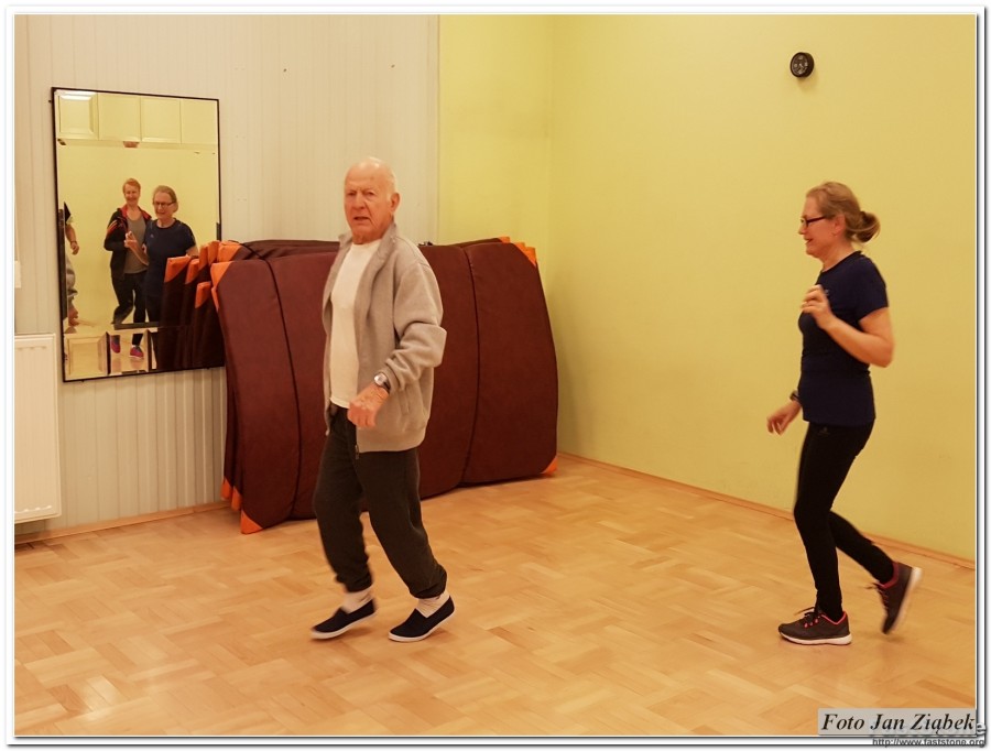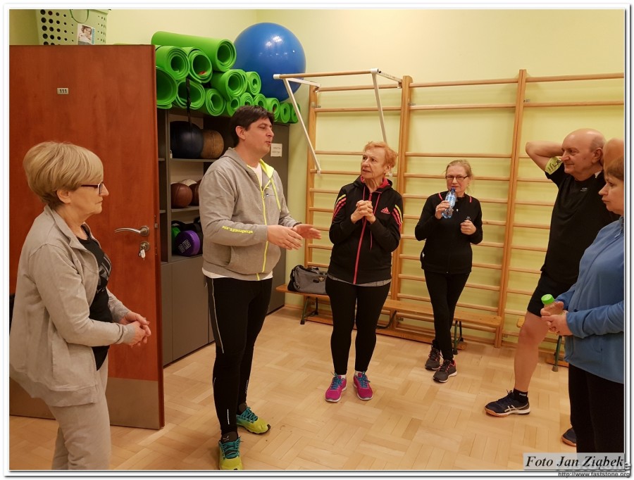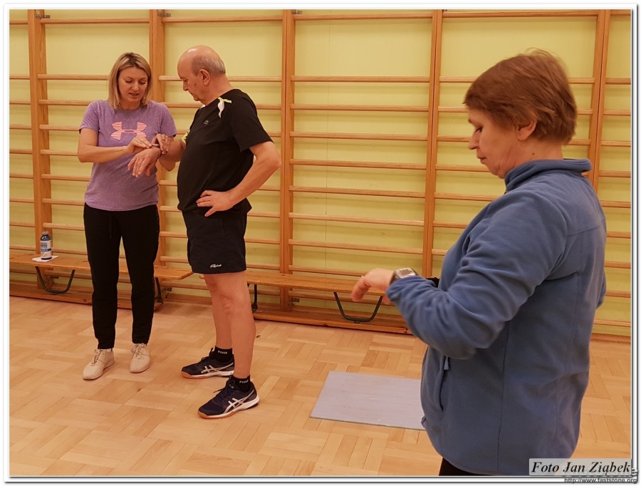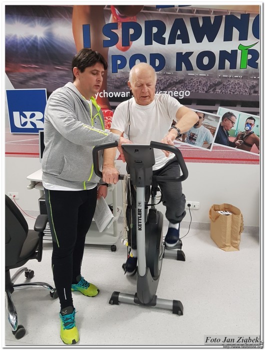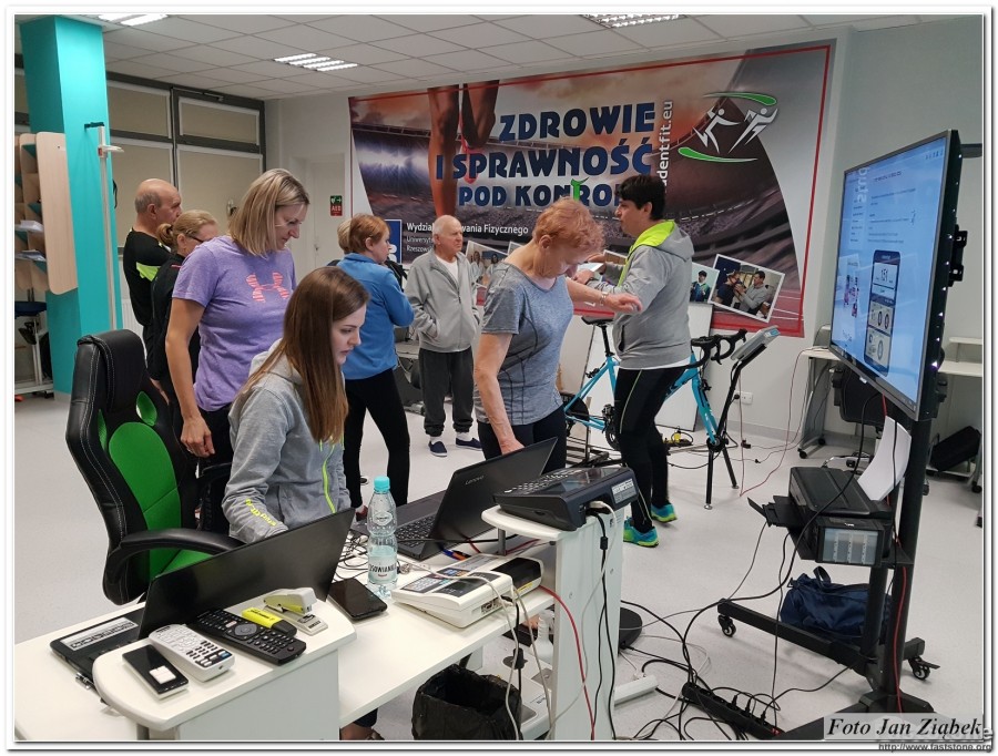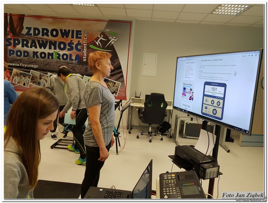 Następnego dnia grupa chętnych słuchaczy (8 osób w wieku 60 do 88 lat) została w laboratoriach zmierzona, zważona, podpięta przez pracownice laboratorium do czujników oraz spróbowała prostych testów wydolnościowych: na rowerku, podczas lekkich ćwiczeń fizycznych (przysiady, marsze, trucht). Czujniki pokazywały indywidualne parametry, a Pan Profesor tłumaczył co one oznaczają, wyliczał na tablicy z danych wnioski do porównań (np. wieku wydolnościowego do aktualnego). Byliśmy nietypową grupą, bo tabele badawcze do porównań rzadko przewidują standardy dla osób powyżej 70 lat. Wnioski zapamiętamy: głównie nieustanna aktywność ruchowa i to w każdym wieku, może zapewnić sprawność organizmu do życia w dobrostanie, w samodzielności, zachowanie jak najdłużej sprawności, również umysłowej.
