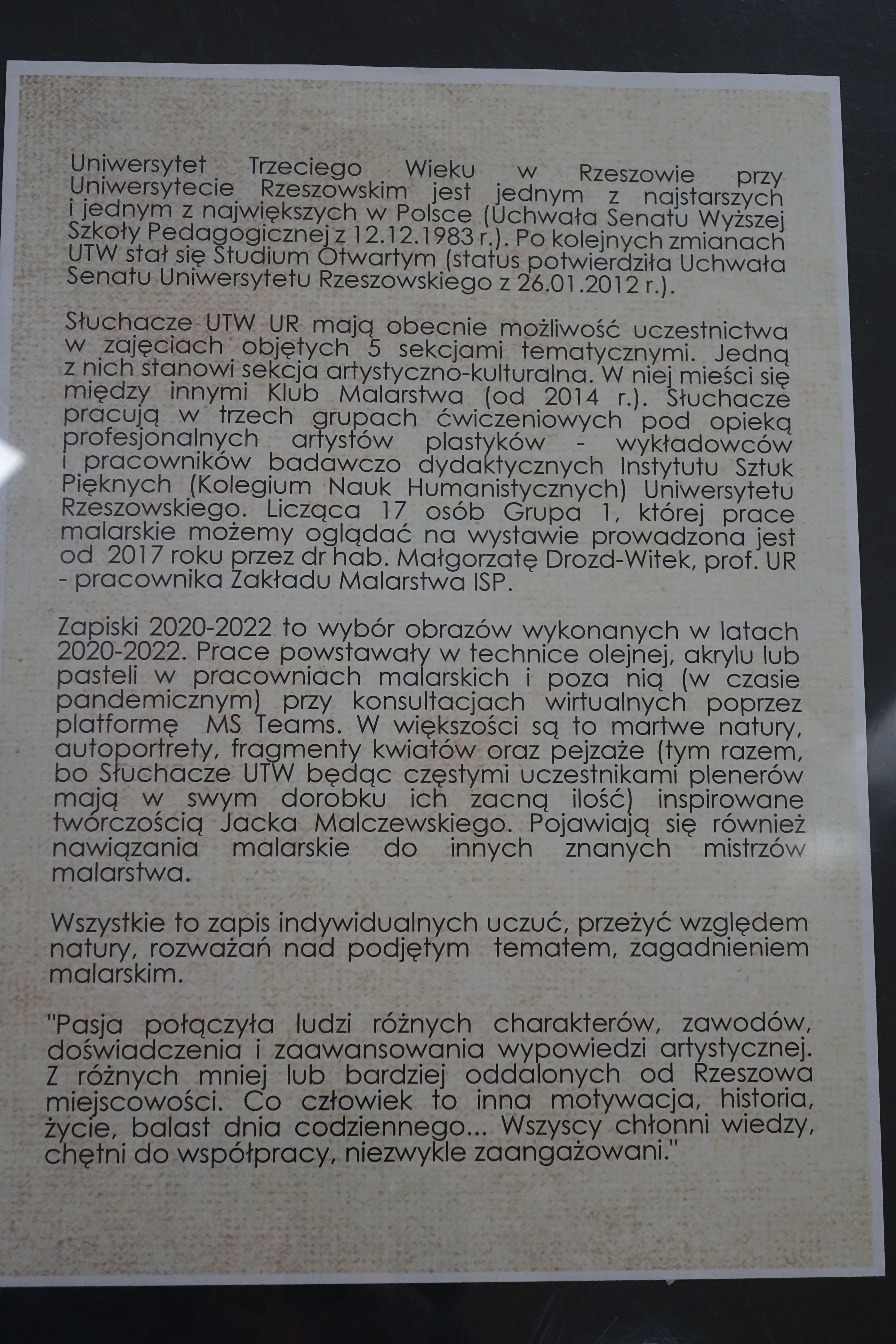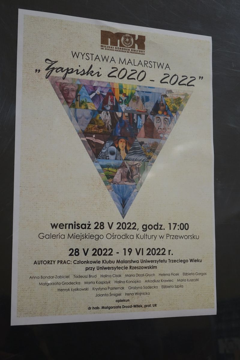 Grupa I Klubu malarstwa UTW-UR zorganizowała wystawę swoich prac w Galerii Miejskiego Ośrodka Kultury w Przeworsku. Było to możliwe dzięki zaangażowaniu i pomocy pani prof. Małgorzaty Drozd-Witek - osoby prowadzącej naszą grupę od kilku lat oraz dzięki życzliwości Dyrektora MOK w Przeworsku - pana Marka Frączka, który udostępnił nam miejską galerię.