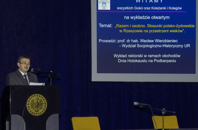 Wykład rektorski w ramach obchodów "Dni Pamięci Holokaustu na Podkarpaciu" przeprowadził prof. dr hab Wacław Wierzbieniec z UR. Oprócz ocen historyka na temat wspólnego bytowania na ziemiach polskich mniejszości żydowskiej, Pan Profesor przedstawił fakty o znaczącym wkładzie i dorobku kulturalnym Polaków pochodzenia żydowskiego. Wysłuchaliśmy też patriotycznej pieśni śpiewanej przez Pana Profesora w języku jidysz, która była śpiewana kiedyś w państwowe święta, np. 3-go Maja w synagogach w prze
