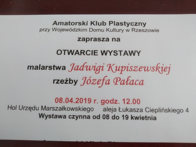 Amatorski klub plastyczny przy WDK zaprasza na otwarcie wystway Jadwigi Kupiszewskiej i Józefa Pałaca w dniu 8 kwietnia br. o godz. 12.00 w holu Urzędu Marszałkowskiego. Wystawa będzie czynna od 8 do