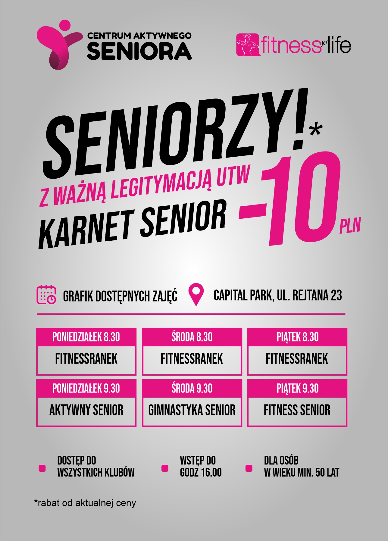 Naszym celem jest zachęcenie do poprawy sprawności oraz zdrowia społeczeństwa - szczególną uwagę kierujemy w stronę Seniorów. Dlatego już dziś chcielibyśmy Państwa zaprosić do dołączenia do Klubu Aktywnego Seniora, który mieści się w naszym Klubie Fitness For Life przy ul. Rejtana 23 (budynek Capital Park).