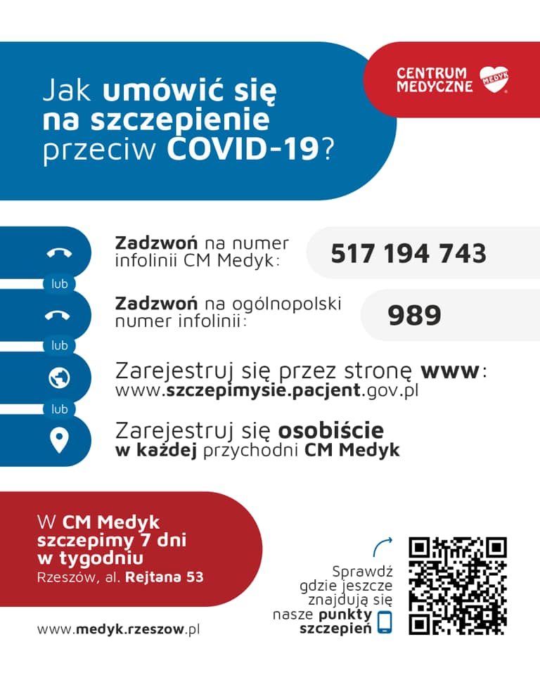 Centrum Medyczne - Medyk rozpoczął cykl szczepień przeciw Covid-19 realizowanych przez 7 dni w tygodniu - dysponuje dużą ilością szczepionek i zaprasza na szczepienia wszystkich chętnych spełniających kryteria zgodne z Narodowym Programem