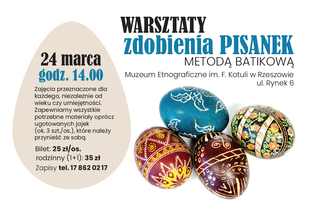 Zapraszamy do zapisów na warsztaty ozdabiania pisanek metodą batikową, które odbędą się w niedzielę 24 marca 2023 o godz. 14:00.