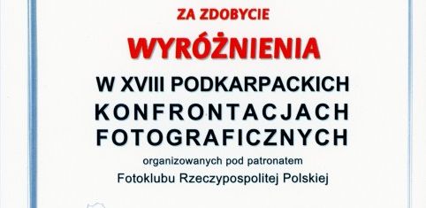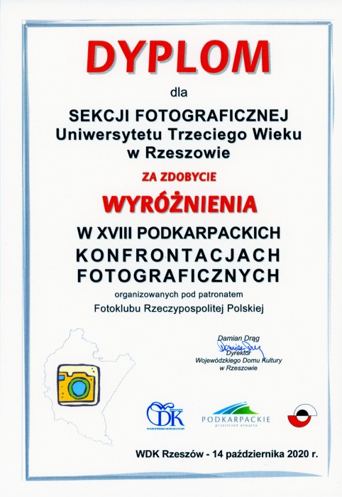 Wyróżnienie dla Klubu Fotografii UTW-UR na XVIII Podkarpackich Konfrontacjach Fotograficznych w WDK w Rzeszowie, 14.10.2020.