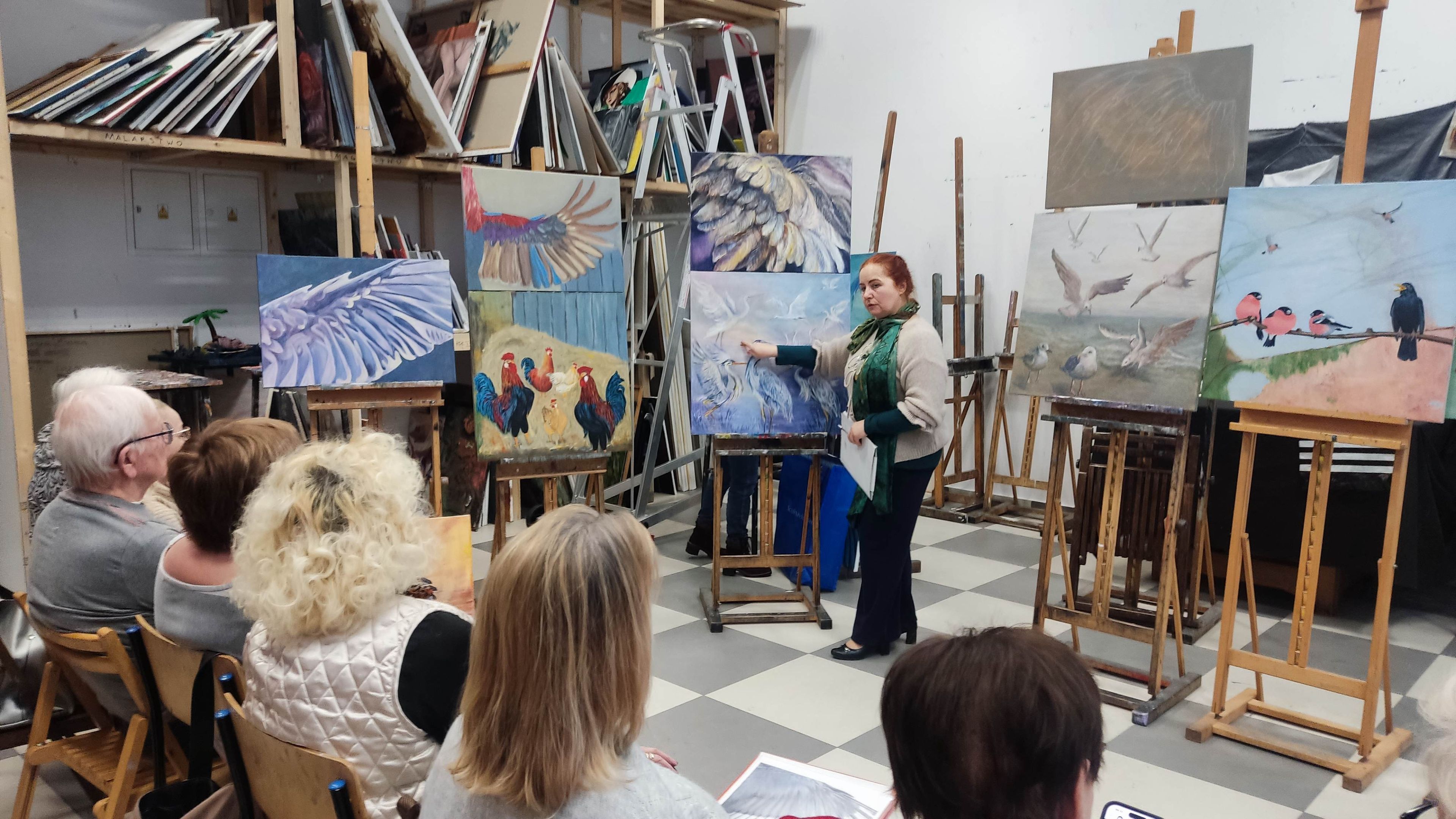 W semestrze tym malowaliśmy obrazy o rozmiarach 70x70 na temat - "Ptaki" oraz 70x50 na temat - "Skrzydło."