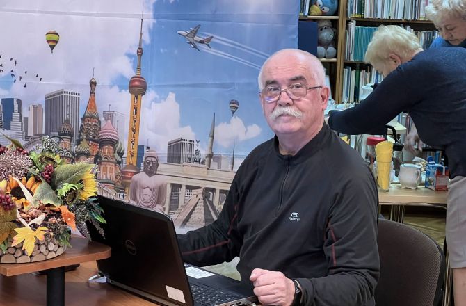 10.04.2025, godz. 13.15, WiMBP ul. Sokoła - prezentacja kol. P.Niemczaka i kol. B.Krypel, uczestników Projektu UR Aktywny senior w hybrydowym środowisku w programie Erasmus+.