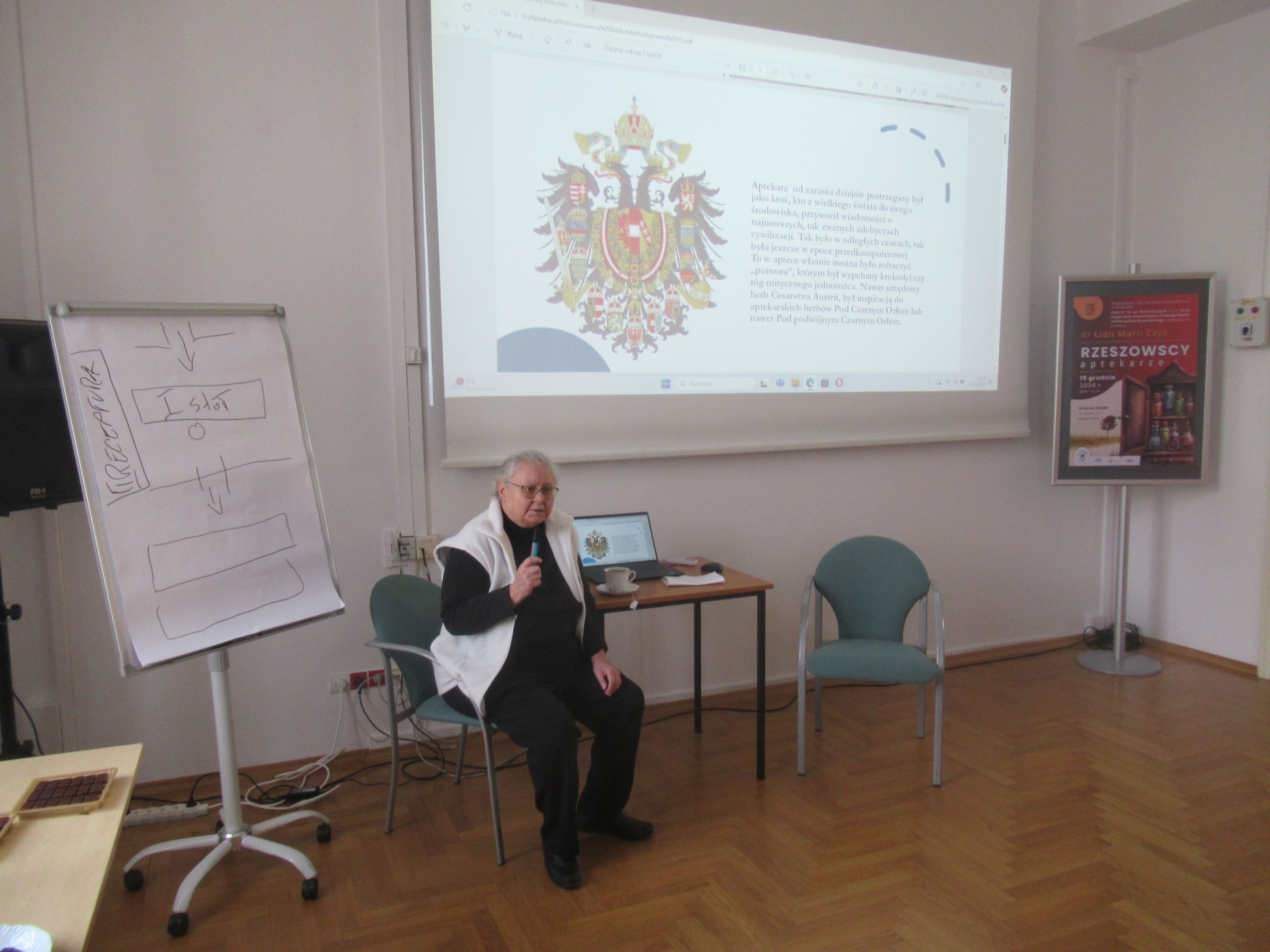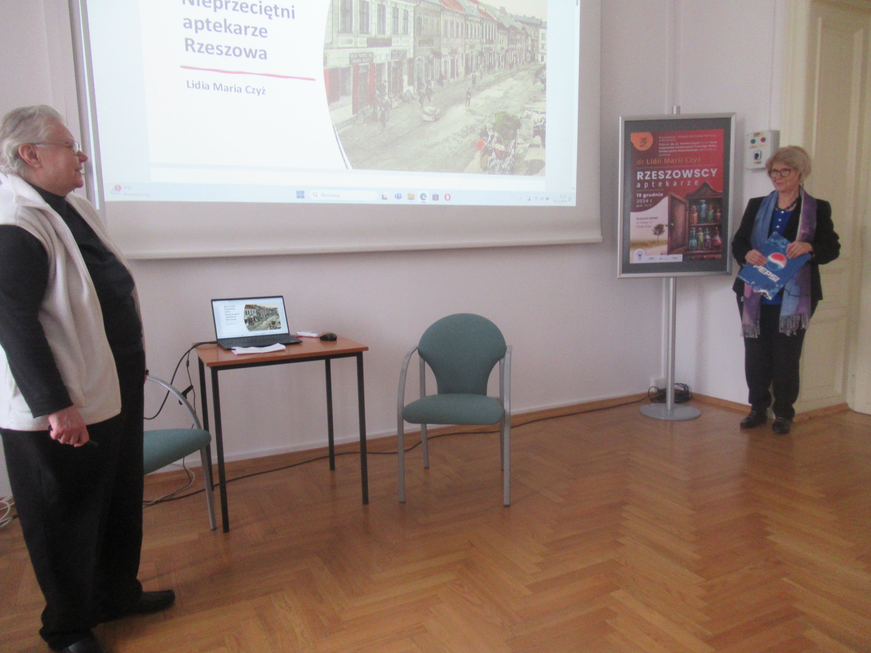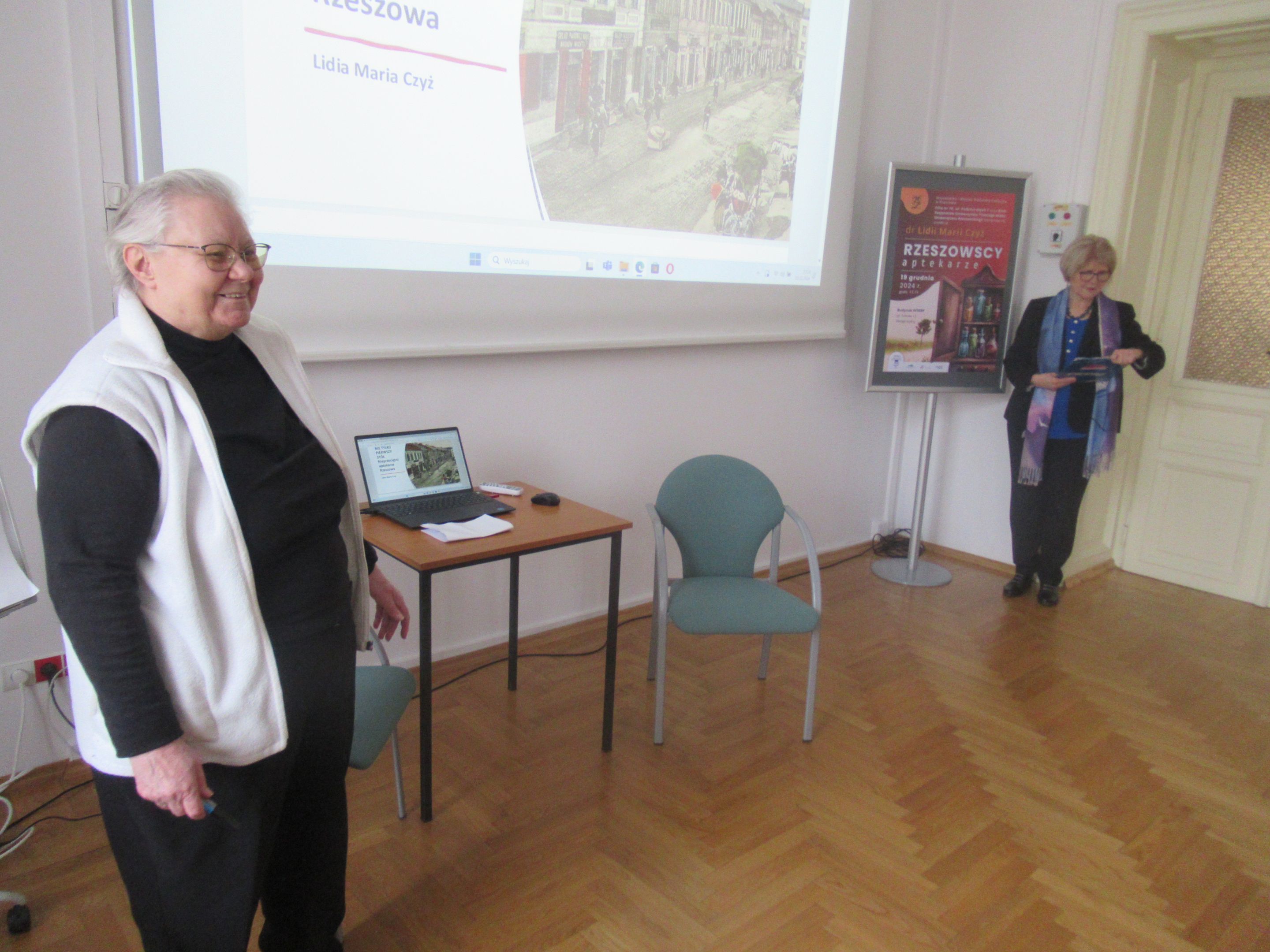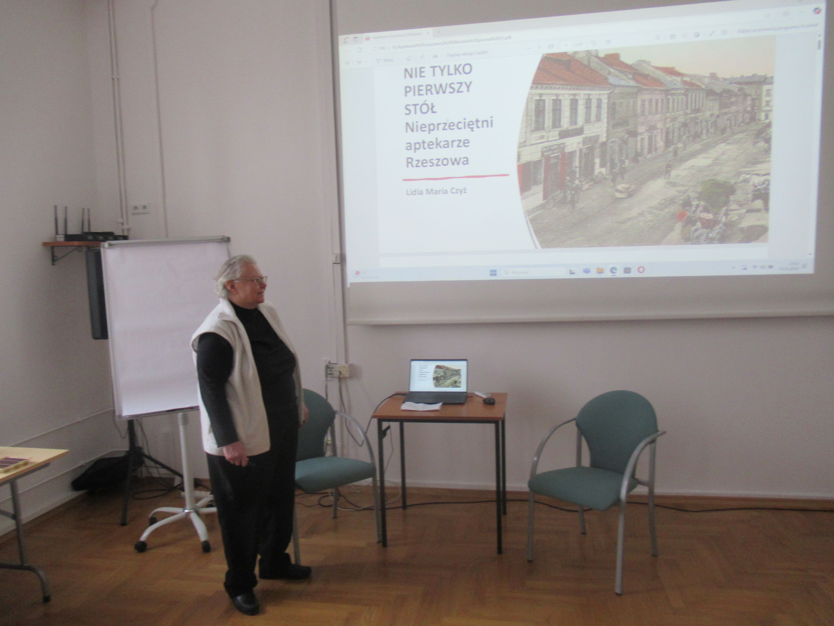 Swoją prelekcję nt. „Rzeszowskich aptekarzy” dr Czyż zaczęła od szkicu historycznego wnętrza typowej apteki, podkreślając rolę „pierwszego stołu”, przy którym toczyła się rozmowa aptekarza z potrzebującym pomocy pacjentem. Wielokrotnie podkreślała, jak długa była droga do tego, aby przyszły aptekarz mógł stanąć przy tym „pierwszym stole”. Wspomniana została między innymi aptekarska droga Ignacego Łukasiewicza, jak również fakt, że mieszkańcy zaboru austriackiego mieli szerokie możliwości zdobywania wykształcenia poza rodzinną Galicją. W kolejnych slajdach zostali przypomniani aptekarze rzeszowscy do XVIII wieku, a później wiele szczegółów, dotyczących historii aptek rzeszowskich począwszy od 1772 roku, czyli od czasów, gdy Rzeszów znalazł się w zaborze austriackim. Obecni na spotkaniu mogli usłyszeć niezwykle ciekawe historie, przede wszystkim związane z dzisiejszą ulicą 3-go Maja, przy której działały pierwsze rzeszowskie apteki, w tym apteka klasztorna zakonu Pijarów. Po likwidacji zakonu w dniu 12 września 1786, pozostałe po aptece wyposażenie przejął Antoni Cynarski. Wdowa po Antonim poślubiła Edwarda Hibla, który z kolei owdowiawszy ożenił się z Klarą Swoboda, bratanicą aptekarza w Łańcucie. Po nagłej śmierci Hiblów w 1848 roku ich młodziutka córka Amalia wyszła za mąż za aptekarza Wojciecha Kalinowskiego, późniejszego trzykrotnego burmistrza Rzeszowa. Od spadkobierców Kalinowskiego aptekę nabyli Herschdorferowie z dużej rodziny aptekarskiej. Dworek Hiblów razem z apteką został rozebrany w roku 1909 podczas modernizacji miasta. Powstała wtedy na rogu ul. Jagiellońskiej i 3-go Maja apteka stoi do dzisiaj. Druga w mieście apteka Antoniego Karpińskiego powstała przy Rynku, róg Mickiewicza. Prelegentka przypomniała kolejnych właścicieli i dzierżawców także tej apteki. Trzecia stała rzeszowska apteka została założona przez Józefa Kołodziejskiego przy ul Gałęzowskiego z wejściem od Rynku Nowego Miasta. Jej dzierżawcą został A. F. Lipczyński, który z czasem założył własną aptekę. Czwarta apteka to apteka Czesława Zubrzyckiego przy ul. Zamkowej. Kolejne dwie apteki to ta „Pod Głową”, założona na granicy Ruskiej Wsi oraz apteka Ferdynanda Lipczyńskiego na rogu Grunwaldzkiej i Matejki.