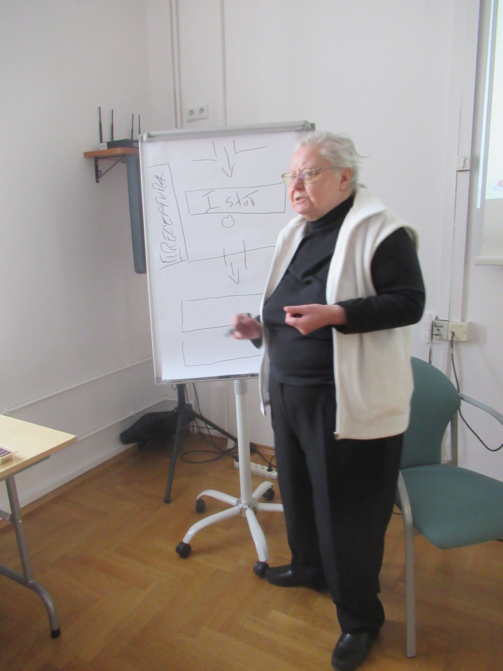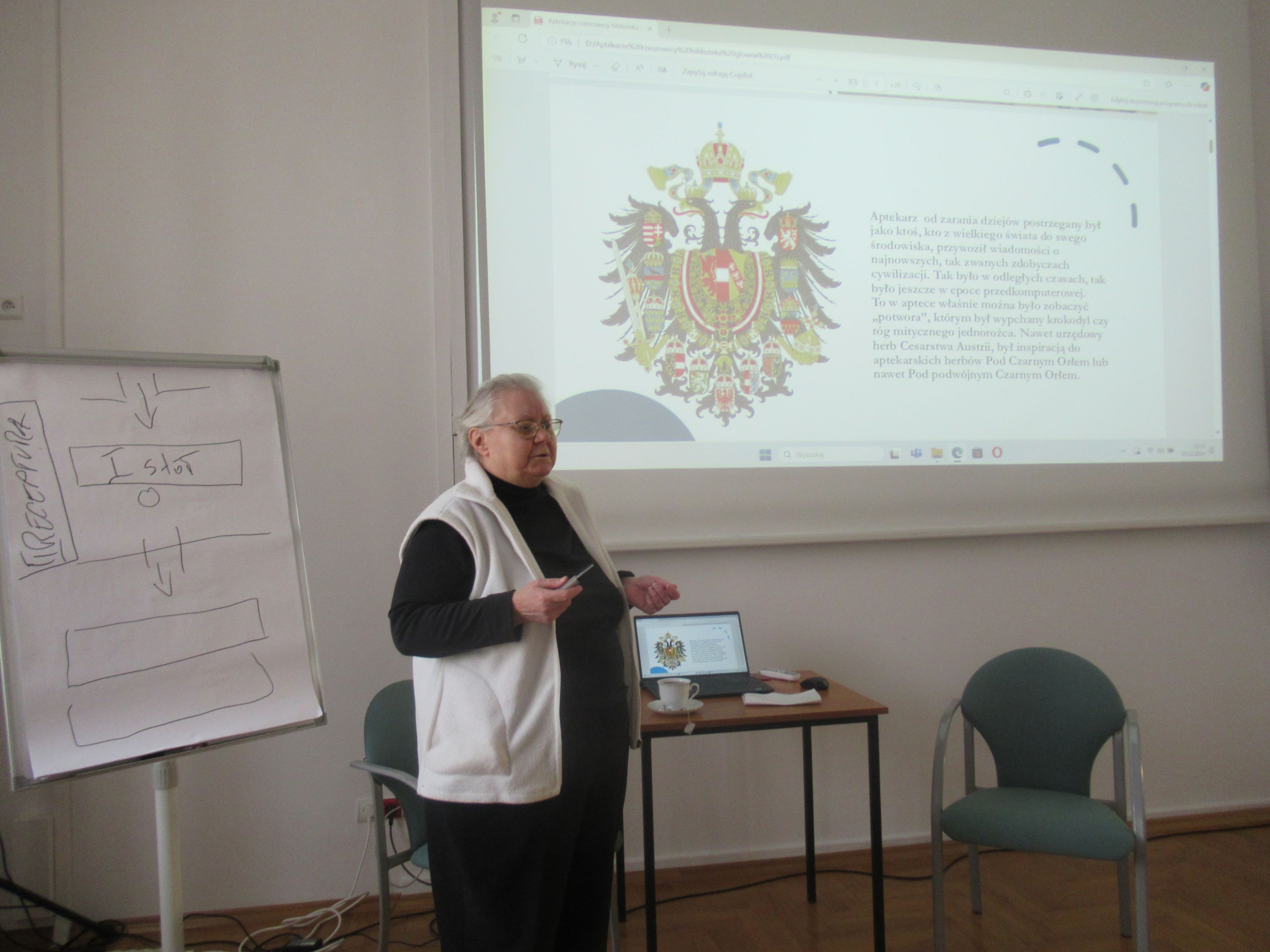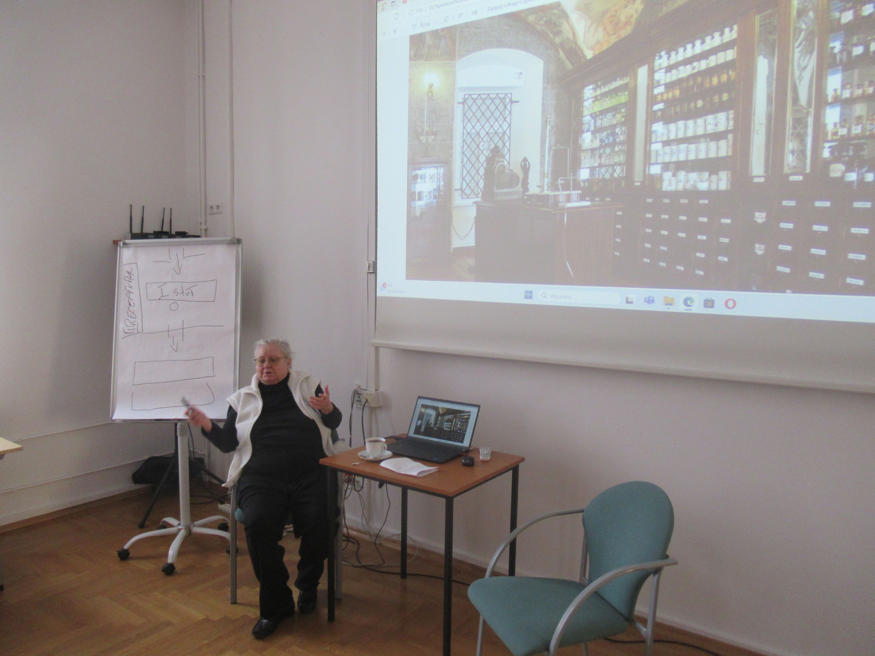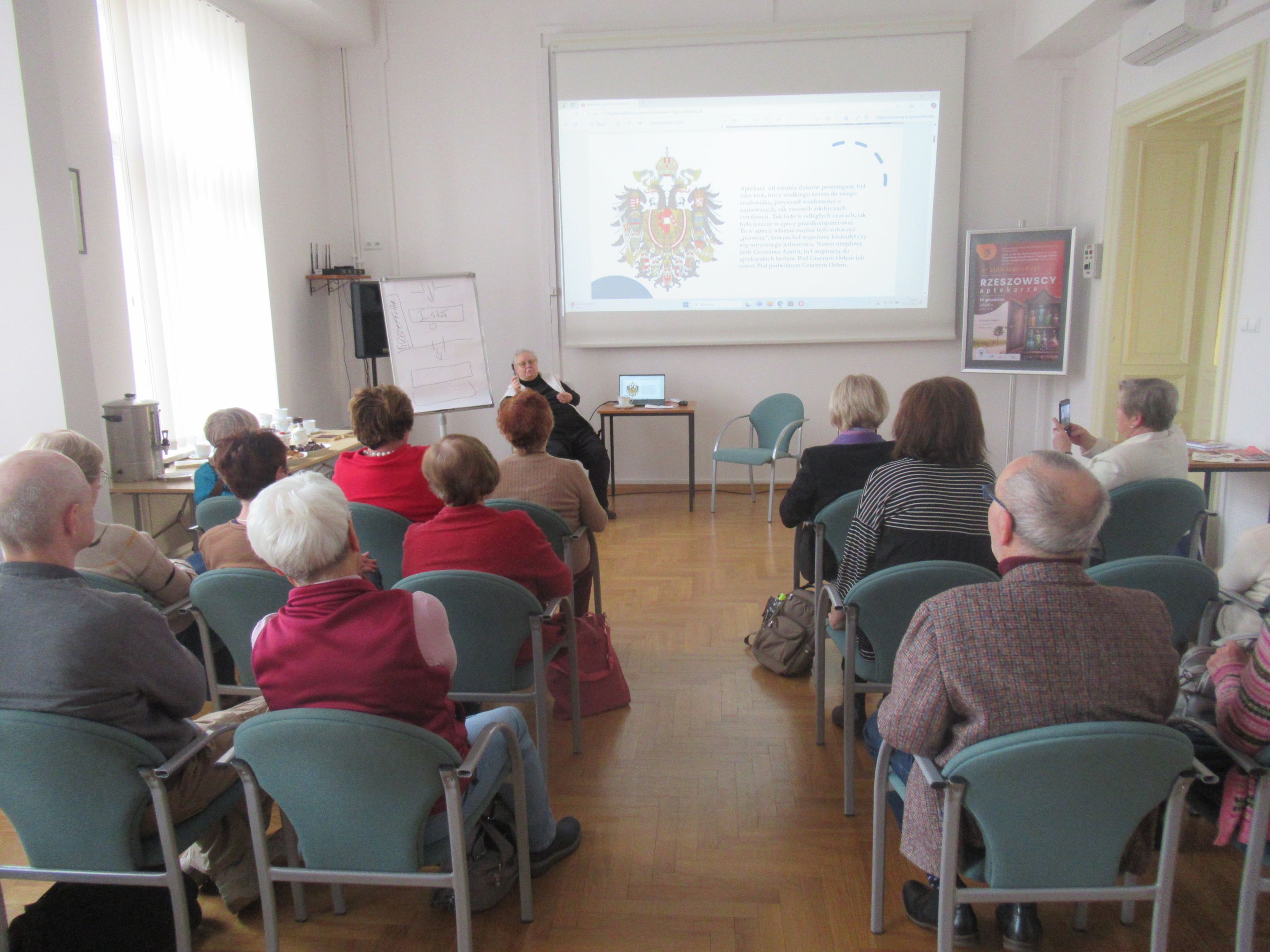 Swoją prelekcję nt. „Rzeszowskich aptekarzy” dr Czyż zaczęła od szkicu historycznego wnętrza typowej apteki, podkreślając rolę „pierwszego stołu”, przy którym toczyła się rozmowa aptekarza z potrzebującym pomocy pacjentem. Wielokrotnie podkreślała, jak długa była droga do tego, aby przyszły aptekarz mógł stanąć przy tym „pierwszym stole”. Wspomniana została między innymi aptekarska droga Ignacego Łukasiewicza, jak również fakt, że mieszkańcy zaboru austriackiego mieli szerokie możliwości zdobywania wykształcenia poza rodzinną Galicją. W kolejnych slajdach zostali przypomniani aptekarze rzeszowscy do XVIII wieku, a później wiele szczegółów, dotyczących historii aptek rzeszowskich począwszy od 1772 roku, czyli od czasów, gdy Rzeszów znalazł się w zaborze austriackim. Obecni na spotkaniu mogli usłyszeć niezwykle ciekawe historie, przede wszystkim związane z dzisiejszą ulicą 3-go Maja, przy której działały pierwsze rzeszowskie apteki, w tym apteka klasztorna zakonu Pijarów. Po likwidacji zakonu w dniu 12 września 1786, pozostałe po aptece wyposażenie przejął Antoni Cynarski. Wdowa po Antonim poślubiła Edwarda Hibla, który z kolei owdowiawszy ożenił się z Klarą Swoboda, bratanicą aptekarza w Łańcucie. Po nagłej śmierci Hiblów w 1848 roku ich młodziutka córka Amalia wyszła za mąż za aptekarza Wojciecha Kalinowskiego, późniejszego trzykrotnego burmistrza Rzeszowa. Od spadkobierców Kalinowskiego aptekę nabyli Herschdorferowie z dużej rodziny aptekarskiej. Dworek Hiblów razem z apteką został rozebrany w roku 1909 podczas modernizacji miasta. Powstała wtedy na rogu ul. Jagiellońskiej i 3-go Maja apteka stoi do dzisiaj. Druga w mieście apteka Antoniego Karpińskiego powstała przy Rynku, róg Mickiewicza. Prelegentka przypomniała kolejnych właścicieli i dzierżawców także tej apteki. Trzecia stała rzeszowska apteka została założona przez Józefa Kołodziejskiego przy ul Gałęzowskiego z wejściem od Rynku Nowego Miasta. Jej dzierżawcą został A. F. Lipczyński, który z czasem założył własną aptekę. Czwarta apteka to apteka Czesława Zubrzyckiego przy ul. Zamkowej. Kolejne dwie apteki to ta „Pod Głową”, założona na granicy Ruskiej Wsi oraz apteka Ferdynanda Lipczyńskiego na rogu Grunwaldzkiej i Matejki.