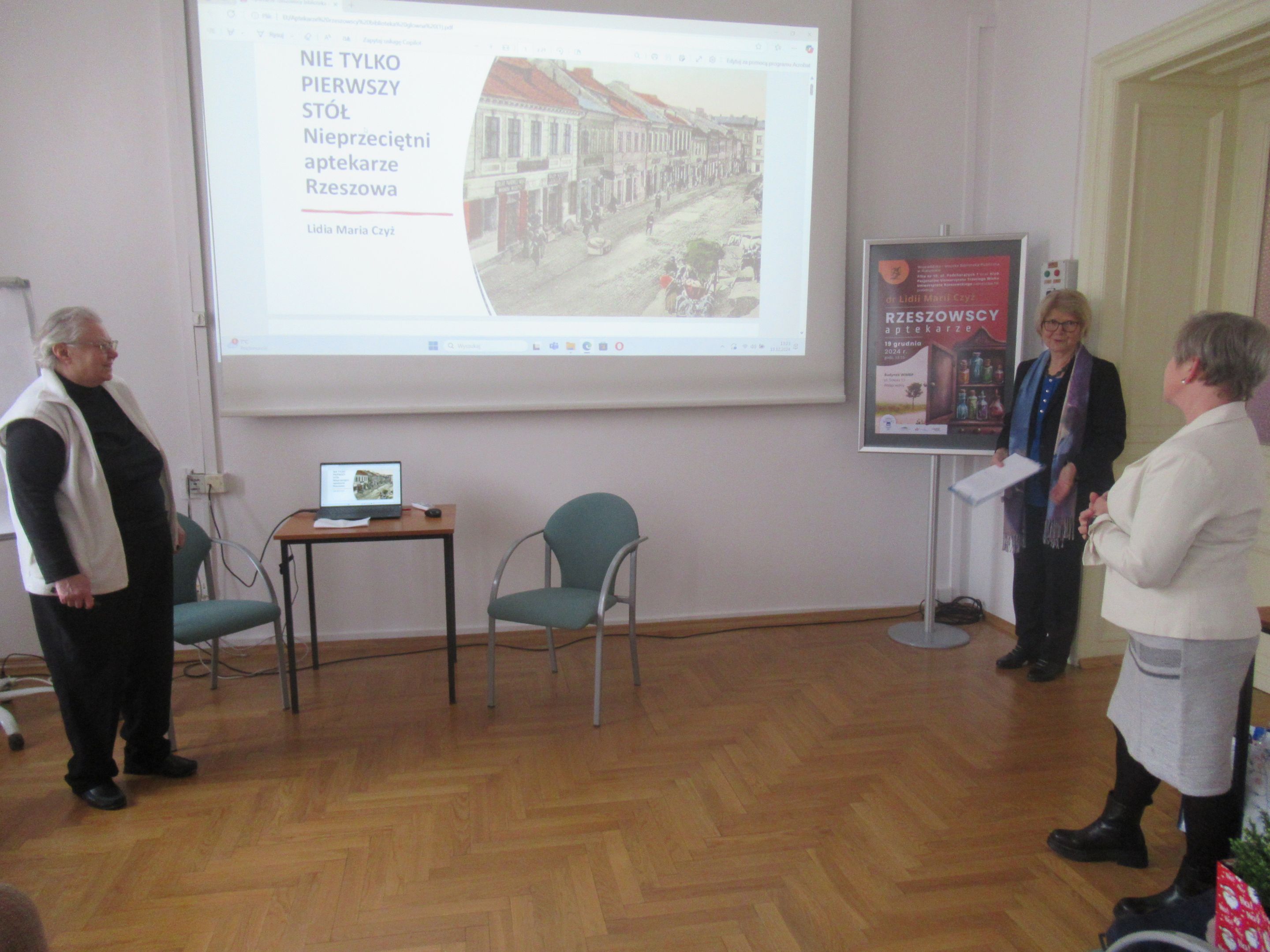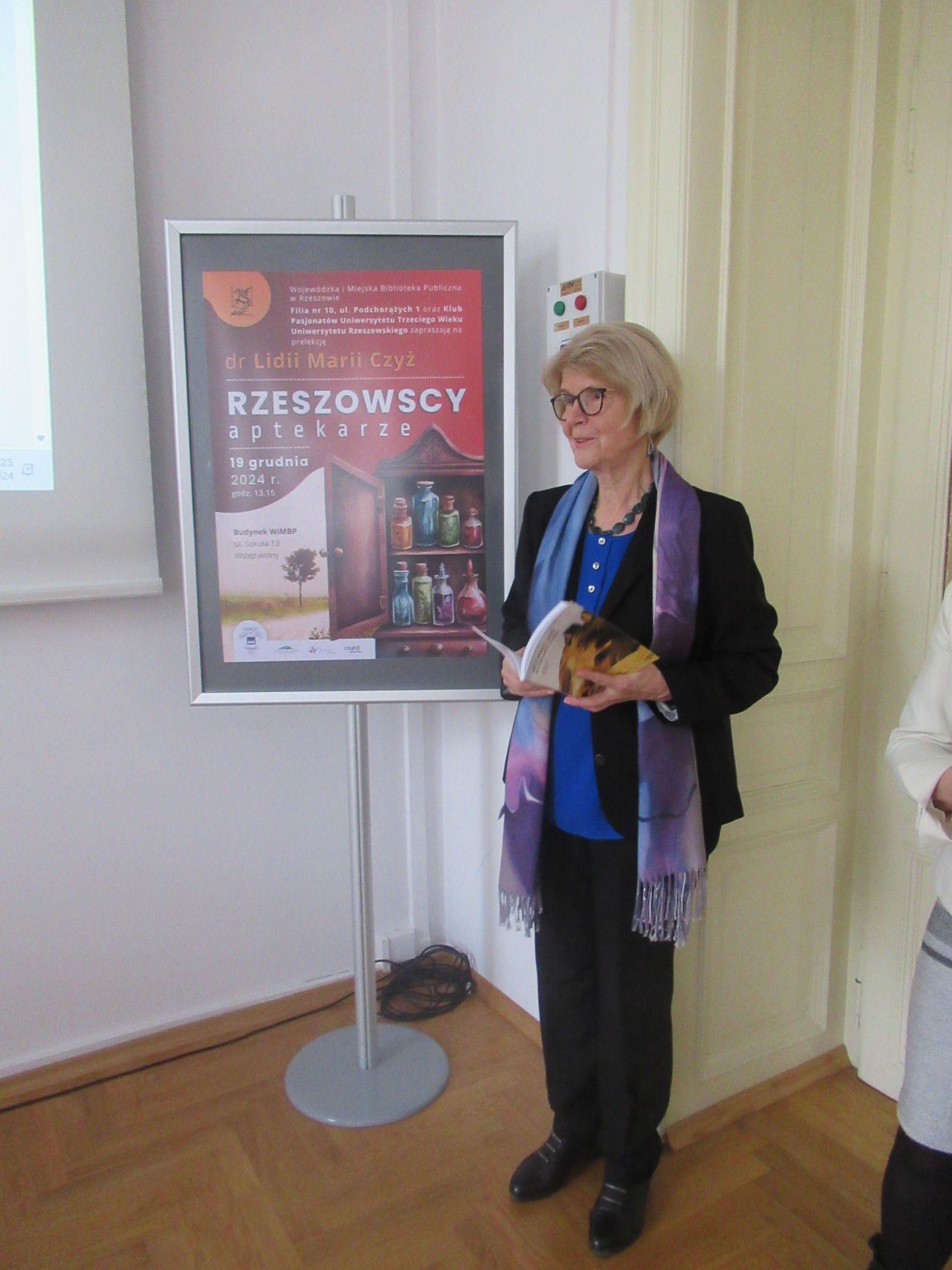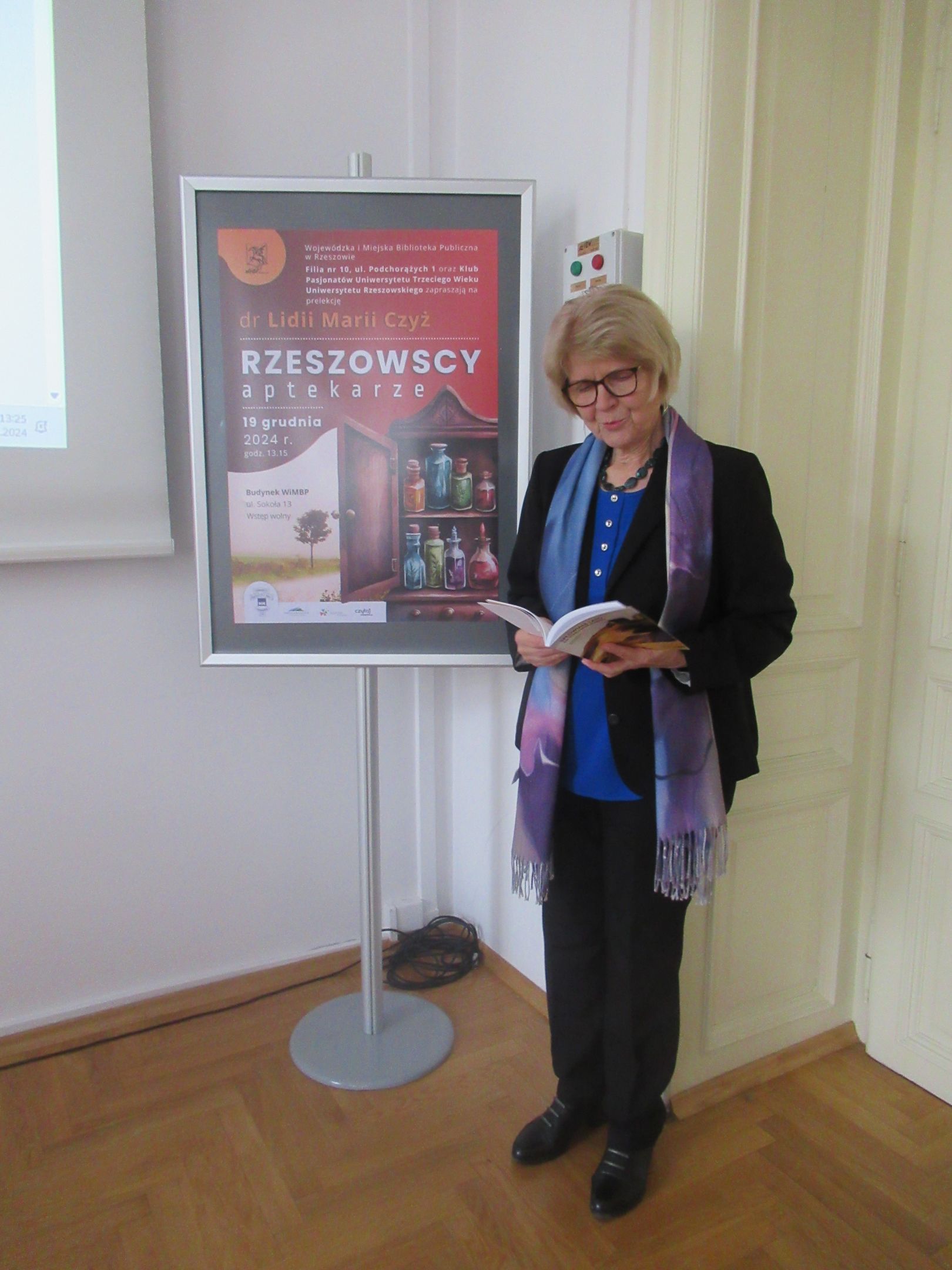Po krótkiej przerwie Klub Pasjonatów powrócił do zaplanowanych spotkań. Tym razem gościem Klubu w dniu 19 grudnia 2024 w budynku WiMBP przy ul. Sokoła była pani Lidia Maria Czyż – doktor nauk o zdrowiu, magister farmacji, zawodowo związana z Uniwersytetem Rzeszowskim, historyk zawodu farmacji, przewodnicząca Ogólnopolskiej Sekcji Historii Farmacji Polskiego Towarzystwa Farmaceutycznego, autorka i współautorka wielu publikacji naukowych w periodykach farmaceutycznych i opracowań dotyczących historii aptek, w tym historii aptek podkarpackich.