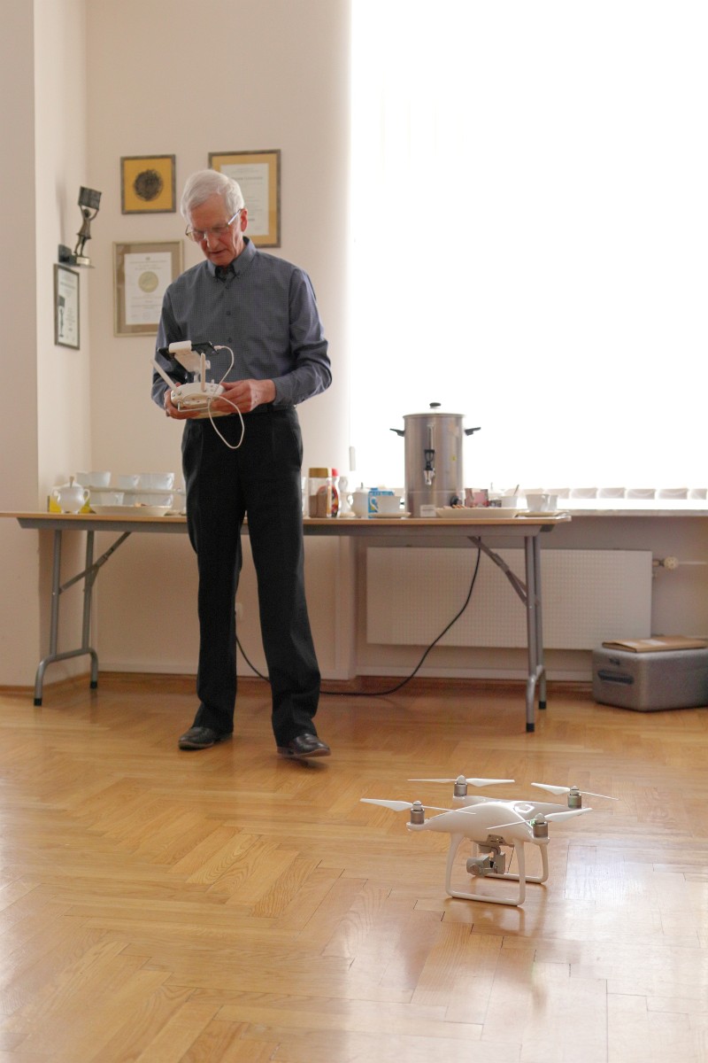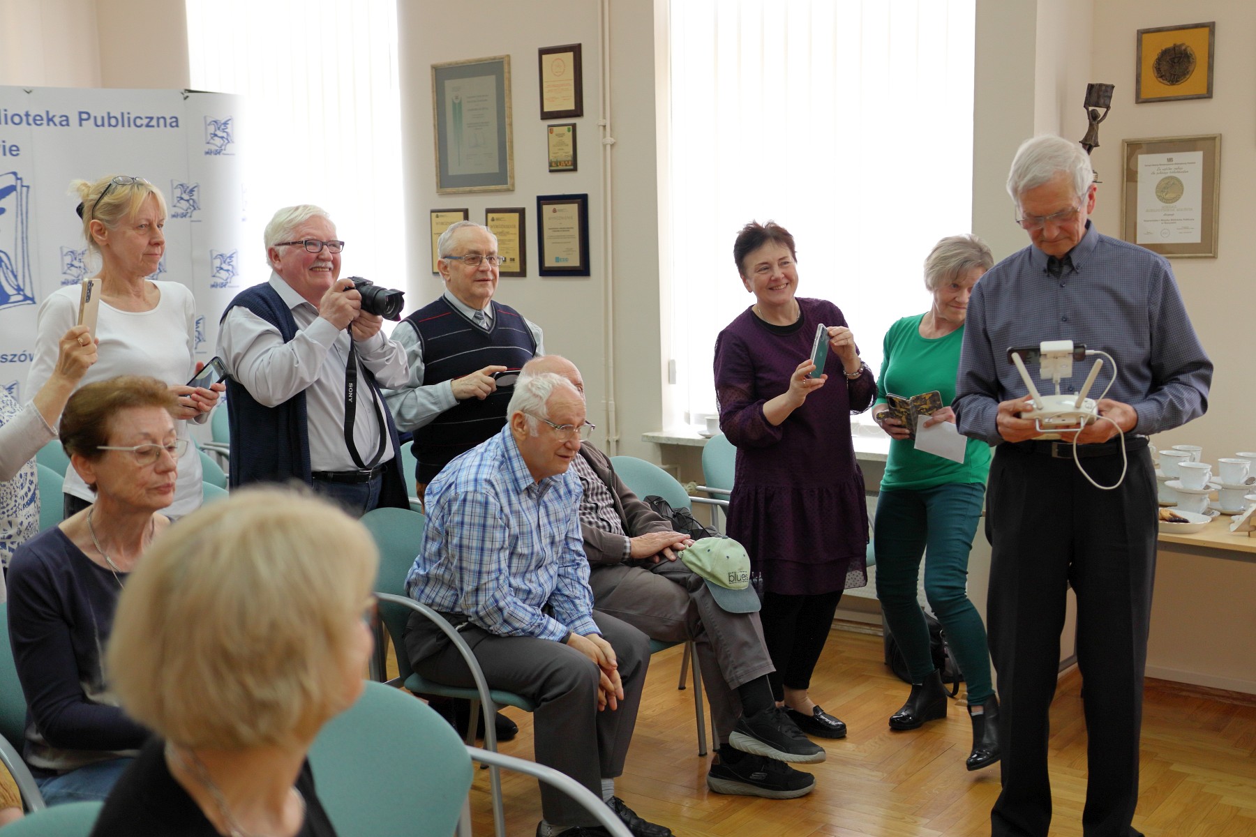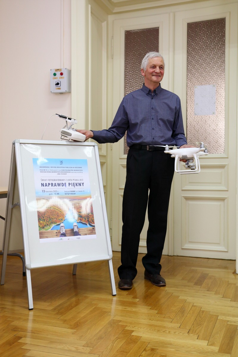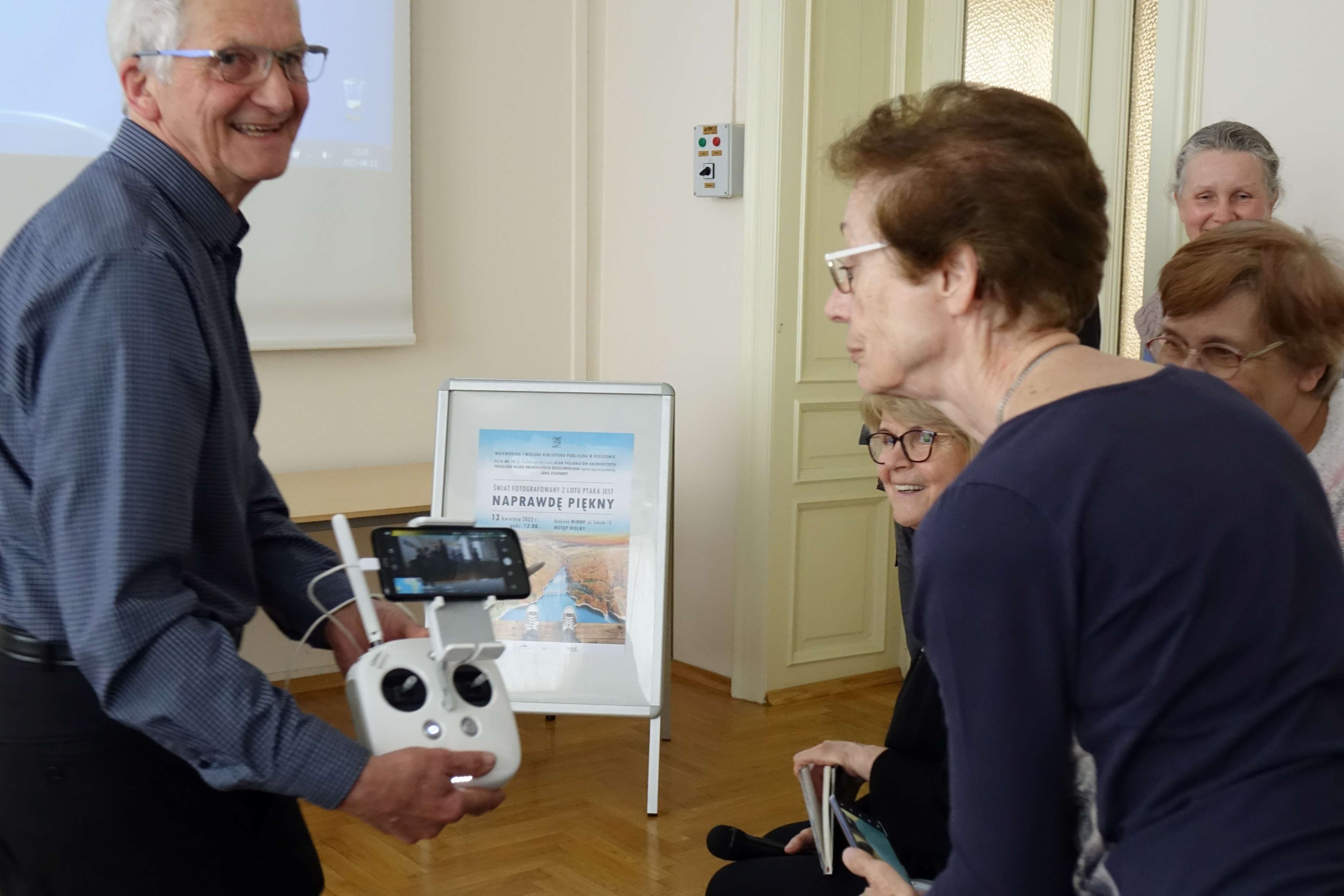 Jan Stachura, którego fotografie były prezentowane w Muzeum Samorządowym Ziemi Strzyżowskiej oraz na indywidualnych i zbiorowych wystawach Klubu Fotografii UTW-UR, rozpoczął spotkanie od krótkiego przedstawienia historii swojej pasji, jaką od 20 lat jest latanie na paralotni i motoparalotni. Najpierw pokazał zebranym krótkie filmiki z początków swojego latania na paralotni – były to loty swobodne, z wykorzystaniem ukształtowania terenu i wznoszących prądów powietrznych. Sterowanie paralotnią odbywa się za pomocą balansu ciała. Potem przyszedł czas na demonstrację motoparalotni – paralotni z podpiętym trójkołowym wózkiem z napędem. Motoparalotnia nie wymaga specjalnych warunków terenowych – można startować na zwykłej, płaskiej łące. Taki właśnie „pas startowy” Jan Stachura posiada na swojej działce. Opowiadaniu o warunkach technicznych latania towarzyszyły filmiki i przepiękne zdjęcia. Prelegent zachwycił zebranych całą serią zdjęć tematycznych, pokazujących między innymi krajobrazy zmieniające się z porami roku - jesienne, zimowe czy wiosenne. Jednak najwięcej westchnień podziwu wzbudziły zdjęcia wykonane we mgle. Tym razem były to już zdjęcia zrobione z wykorzystaniem drona – latanie we mgle na motoparalotni byłoby zbyt niebezpieczne. W trakcie wystąpienia prelegent wielokrotnie podkreślał, że dzięki swojej pasji odwiedził z powietrza całe Podkarpacie i inne regiony Polski, a także sąsiednie kraje. Fotografią zajmował się od zawsze, tworząc archiwum domowe. W pewnym momencie pomyślał, że warto, aby także inni zobaczyli, jak piękny z lotu ptaka jest nasz kraj, a zwłaszcza Podkarpacie. Dzięki aktywności w Klubie Fotografii UTW-UR doskonali techniki fotografowania, bardzo często zwracając uwagę na światło, które potrafi „namalować” wspaniałe krajobrazy, godne impresjonisty. Pobyt wysoko nad ziemią to nie tylko wrażenia wizualne, to także czas na chwilę refleksji nad kruchością życia i słabością człowieka wobec natury. W końcowej części spotkania Jan Stachura zademonstrował swojego drona i zasady jego wykorzystania przy fotografii z lotu ptaka. Ta część spotkania obudziła wiele emocji, co obecni koledzy – fotografowie uchwycili na zdjęciach.