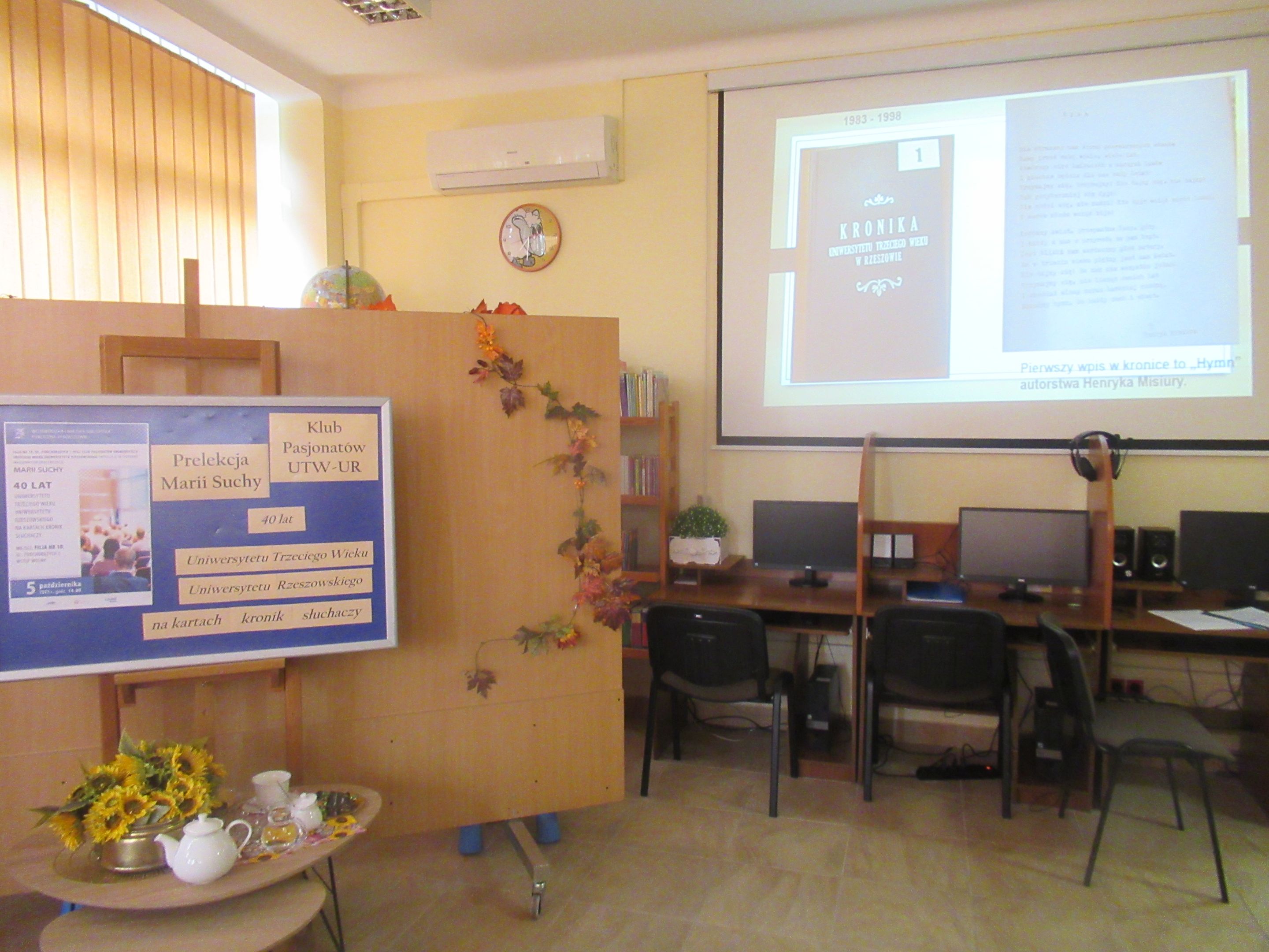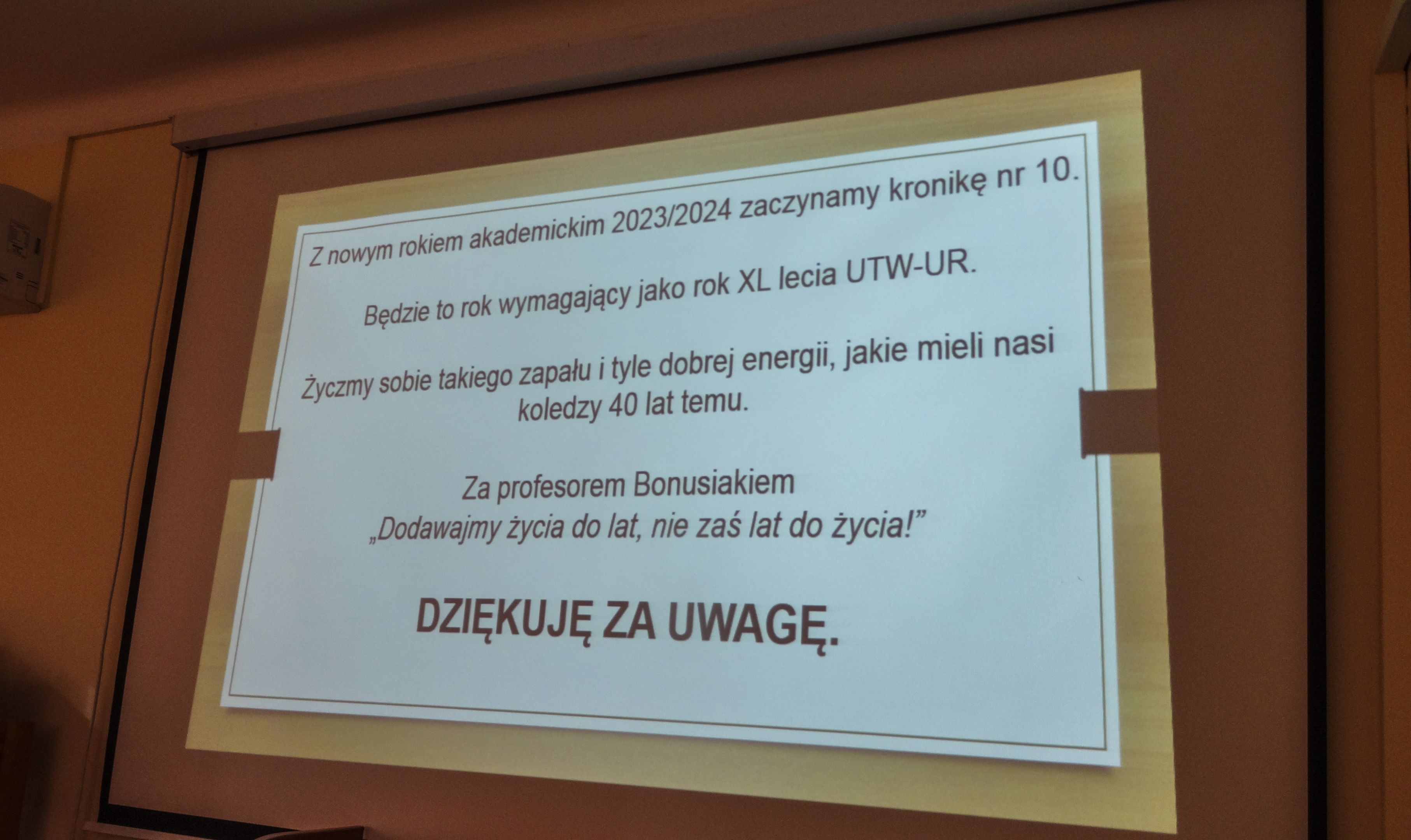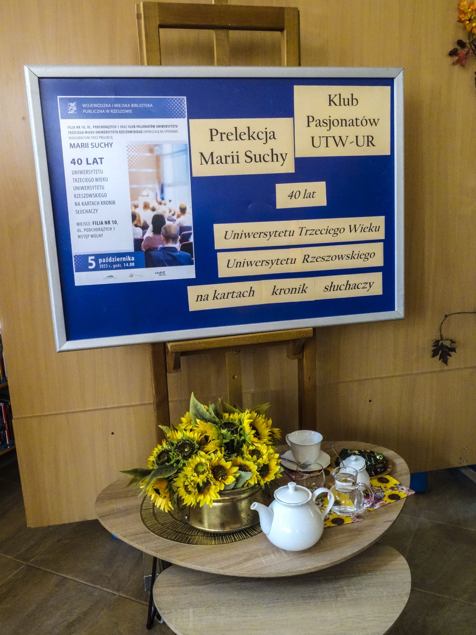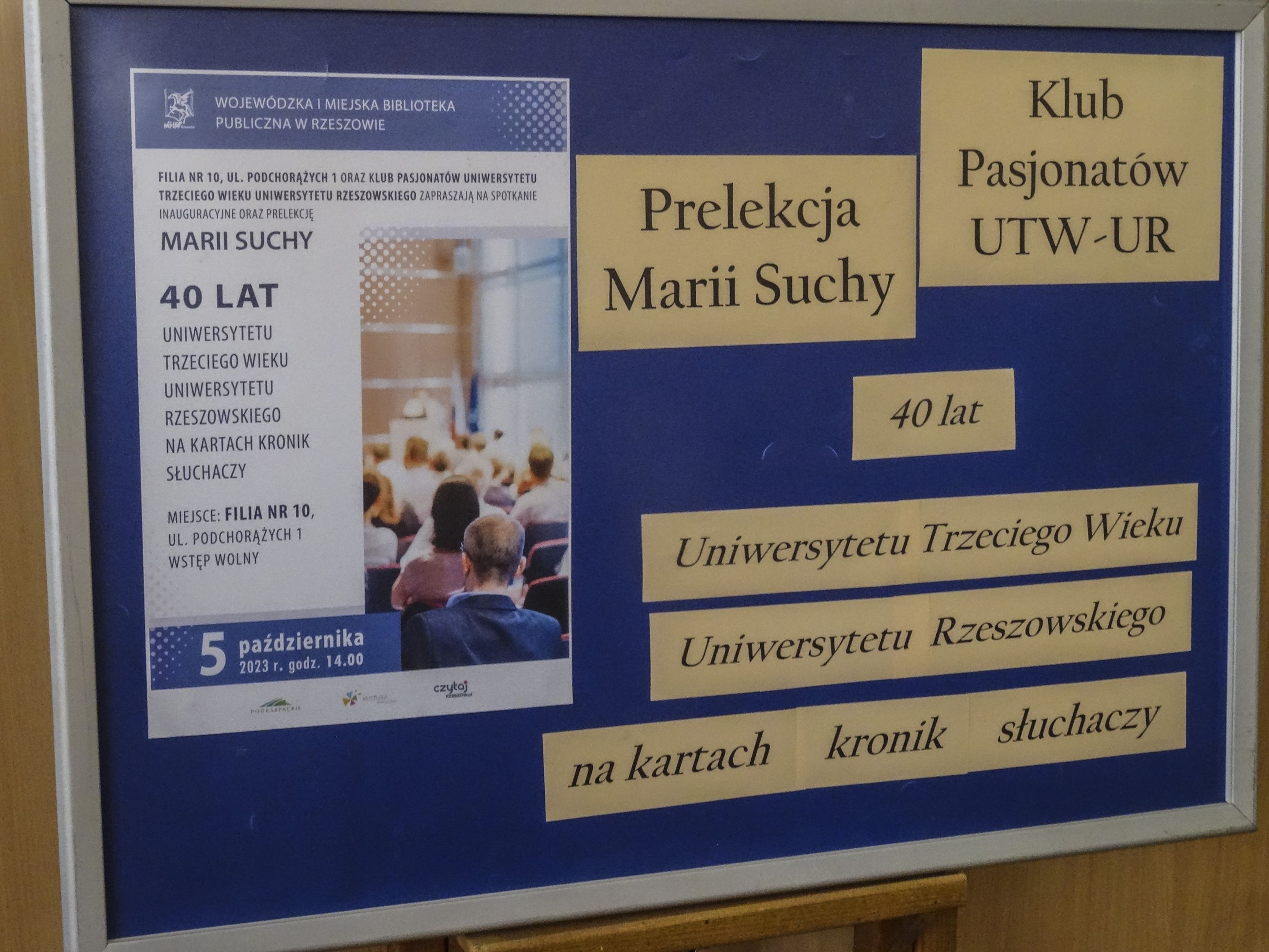 Pierwsze w nowym roku akademickim spotkanie Klubu Pasjonatów UTW-UR odbyło się 5 października 2023 r. w Filii Nr 10 WiMBP przy ul. Podchorążych 1. Było to równocześnie spotkanie organizacyjne, na które przybyło 12 osób, słuchaczy UTW-UR. Do uczestników wydarzenia dołączyła też redaktorka Polskiego Radia Rzeszów pani Anna Leśniewska. Spotkanie otworzyła pani Maria Jamróg, kierowniczka Filii Nr 10 WiMBP przy ul. Podchorążych 1, która witając zebranych wyraziła satysfakcję z faktu, że może gościć seniorów – pasjonatów różnych dziedzin, takich jak czytelnictwo, fotografia czy podróże. Ze względu na to, że rok akademicki 2023/2024 jest rokiem jubileuszu 40-lecia Uniwersytetu Trzeciego Wieku w Rzeszowie, jako temat spotkania otwierającego semestr jesienny zaproponowano prezentację „40 lat UTW-UR na kartach kronik słuchaczy.” Autorką prezentacji jest moderatorka Klubu Pasjonatów UTW-UR, Maria Suchy, która od ośmiu lat prowadzi kroniki UTW-UR.