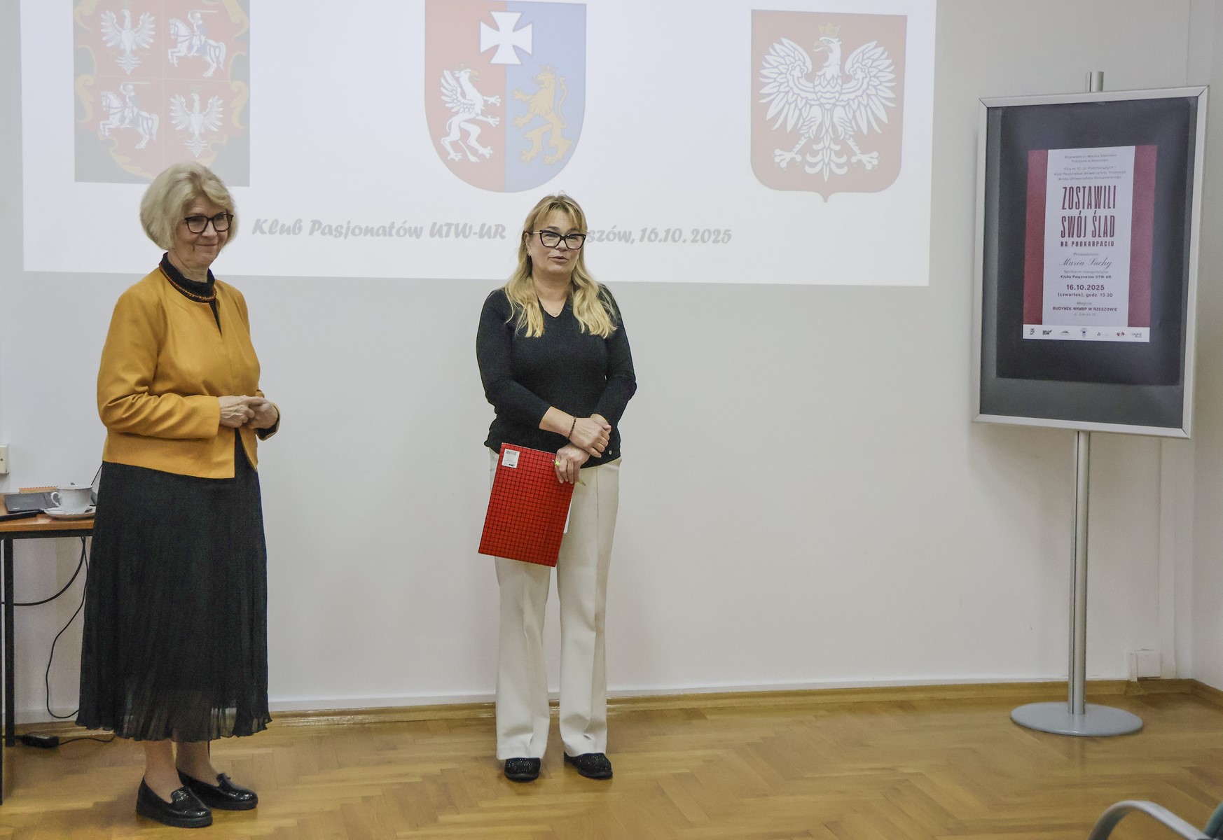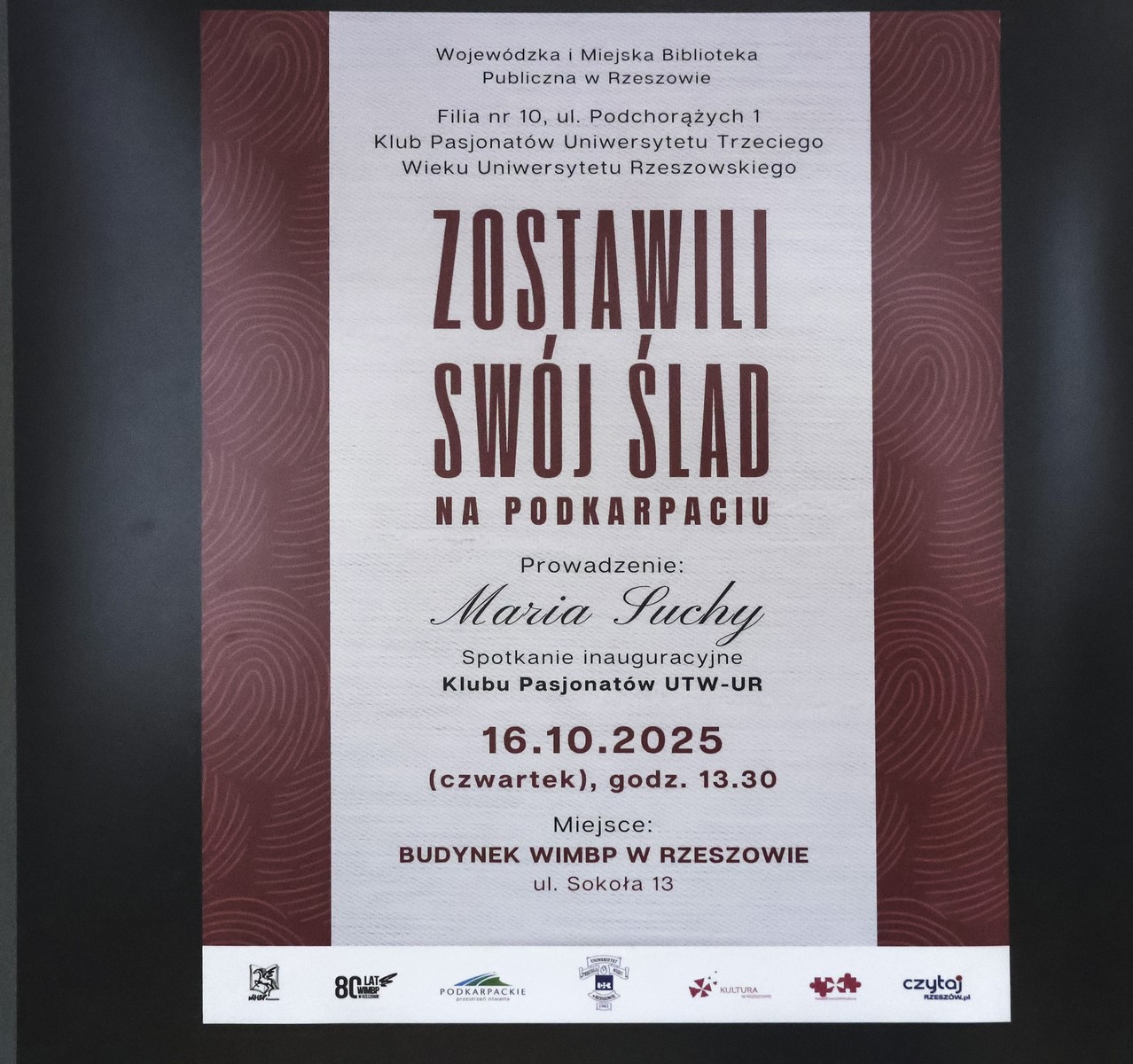 Pierwsze w nowym roku akademickim 2025/2026 spotkanie Klubu Pasjonatów UTW-UR zorganizowano w dniu 16 października 2025 w budynku głównym WiMBP przy ul. Sokoła 13. Temat prezentacji „Zostawili swój ślad na Podkarpaciu” był kontynuacją prelekcji z 20 lutego 2025 „Twórcy i wynalazcy z Podkarpacia”. Tym razem bohaterami byli „wysoko urodzeni”, twórcy i uczeni oraz żołnierze. Przypomniane zostały sylwetki tych, którzy urodzili się na dzisiejszym Podkarpaciu lub przebywali tutaj, zostawiając swój ślad w pomnikach, tablicach pamiątkowych czy nazwach ulic.