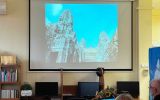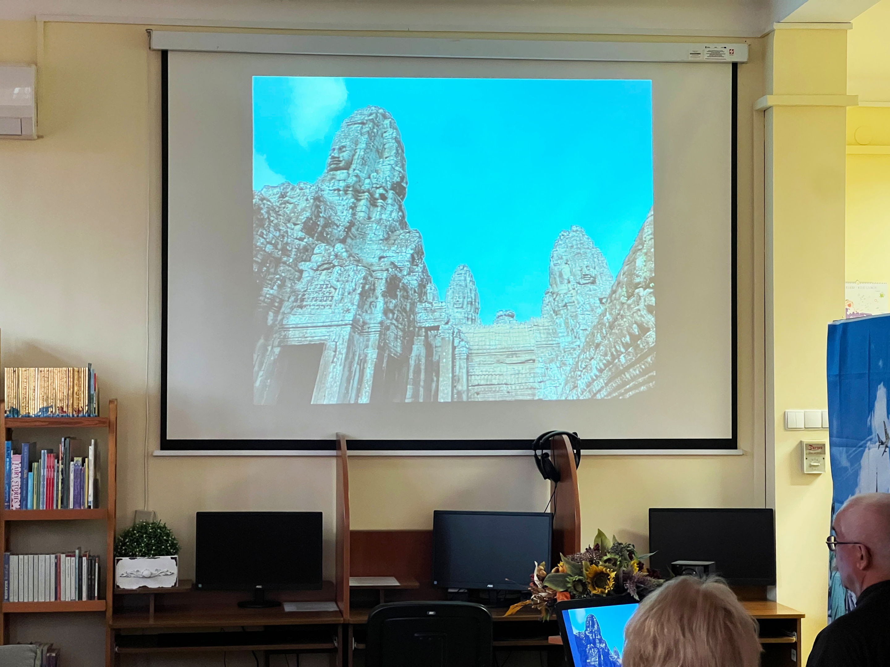 Oprócz własnych fotografii, prelegent pokazał fragment filmu ze świątyni ANGKOR WAT z Kambodży oraz migawki krajobrazu z francuskiego filmu fabularnego „Indochiny”. Angkor Wat to największy na świecie kompleks świątynny i główny symbol Kambodży, zbudowany w XII wieku ku czci hinduskiego bóstwa Wisznu. Kompleks ten, który z czasem stał się świątynią buddyjską, od 1992 roku znajduje się na liście Światowego Dziedzictwa UNESCO. Wokół świątyń biegnie system kanałów i zbiorników wodnych, pełniących funkcje obronne oraz istotnych dla rozwoju cywilizacji Khmerów.