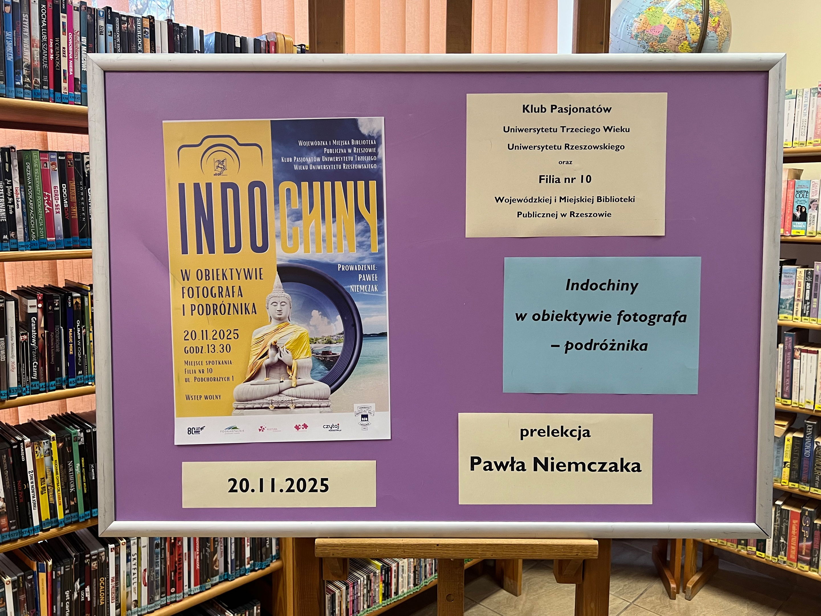 Kolejne spotkanie Klubu Pasjonatów UTW-UR miało miejsce 20 listopada 2025 r. w gościnnych progach Filii Nr 10 WiMBP w Rzeszowie przy ul. Podchorążych 1. Prelekcja „INDOCHINY” przygotowana przez fotografa i podróżnika Pawła Niemczaka zgromadziła blisko 20 słuchaczy. Tym razem mieliśmy okazję zobaczyć najczęściej nie dostrzegane przez turystów obrazki życia codziennego: Kambodży, Laosu i Wietnamu. Nie zabrakło także urzekających zdjęć przyrody.