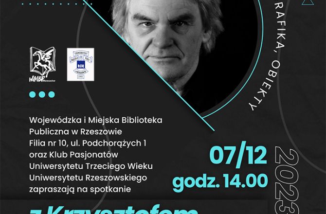 7 grudnia 2023 r. godz. 14.00, WiMBP ul. Sokoła 13, Klub Pasjonatów UR zaprasza na spotkanie z Krzysztofem Pisarkiem z Instytutu sztuk Pięknych UR.