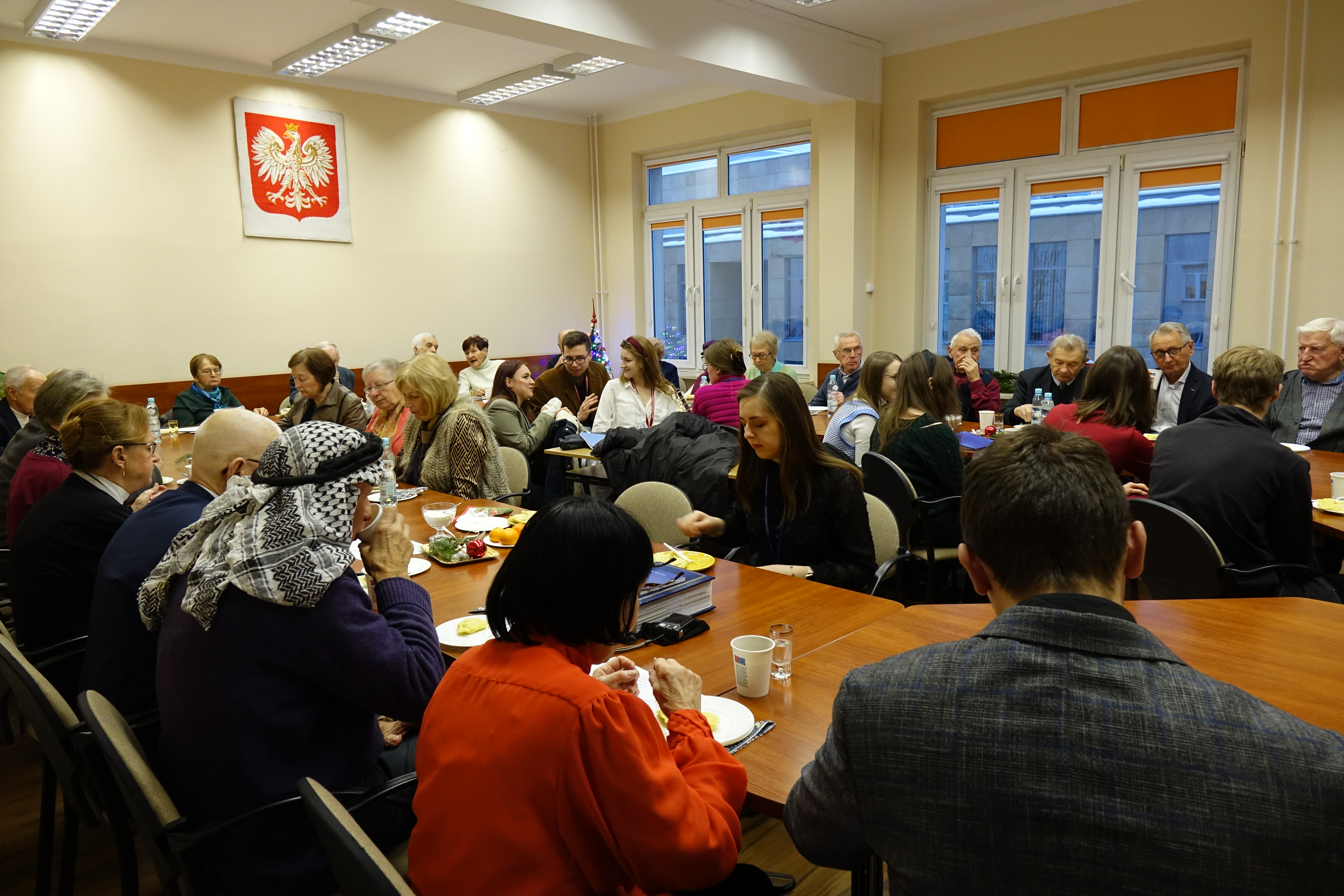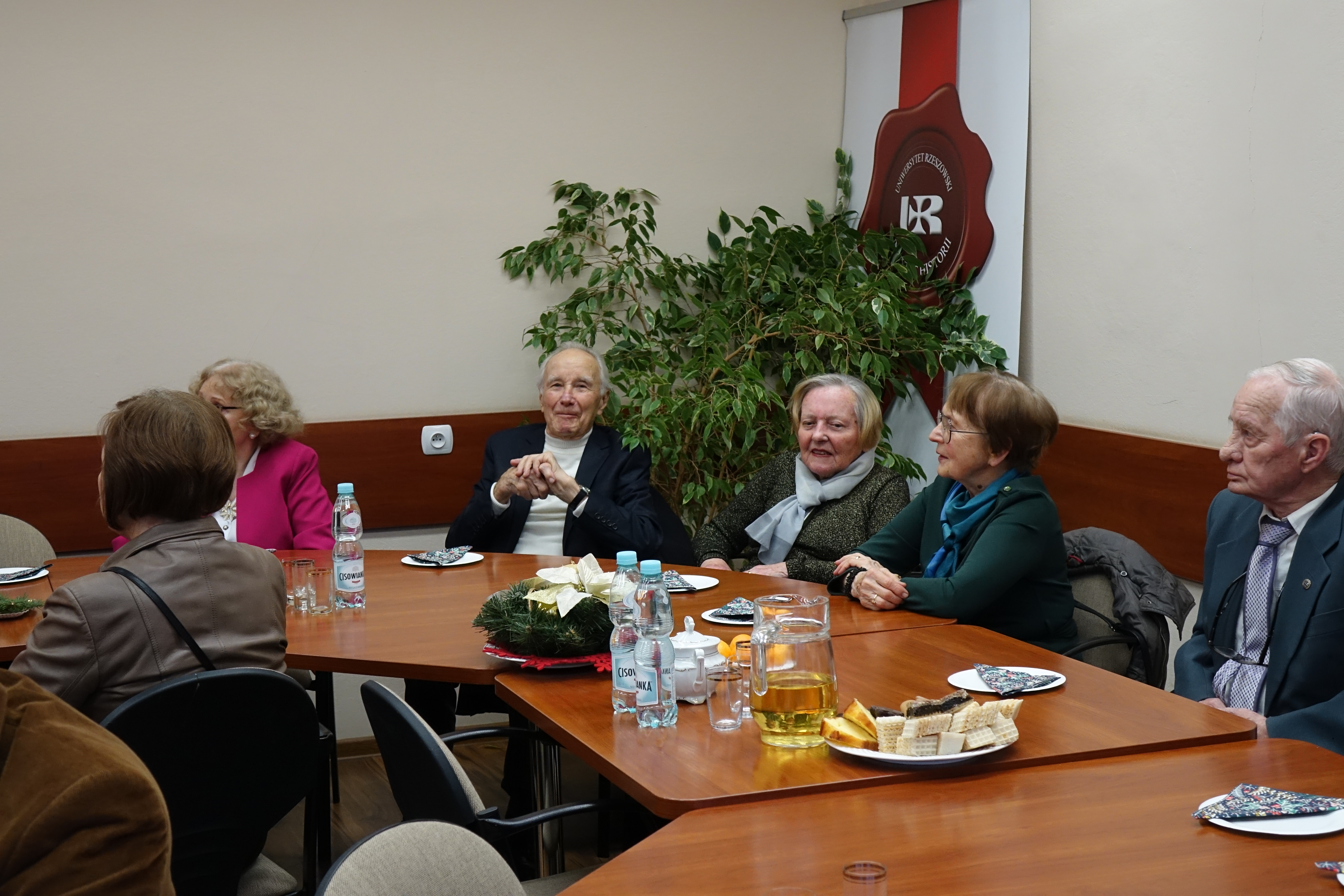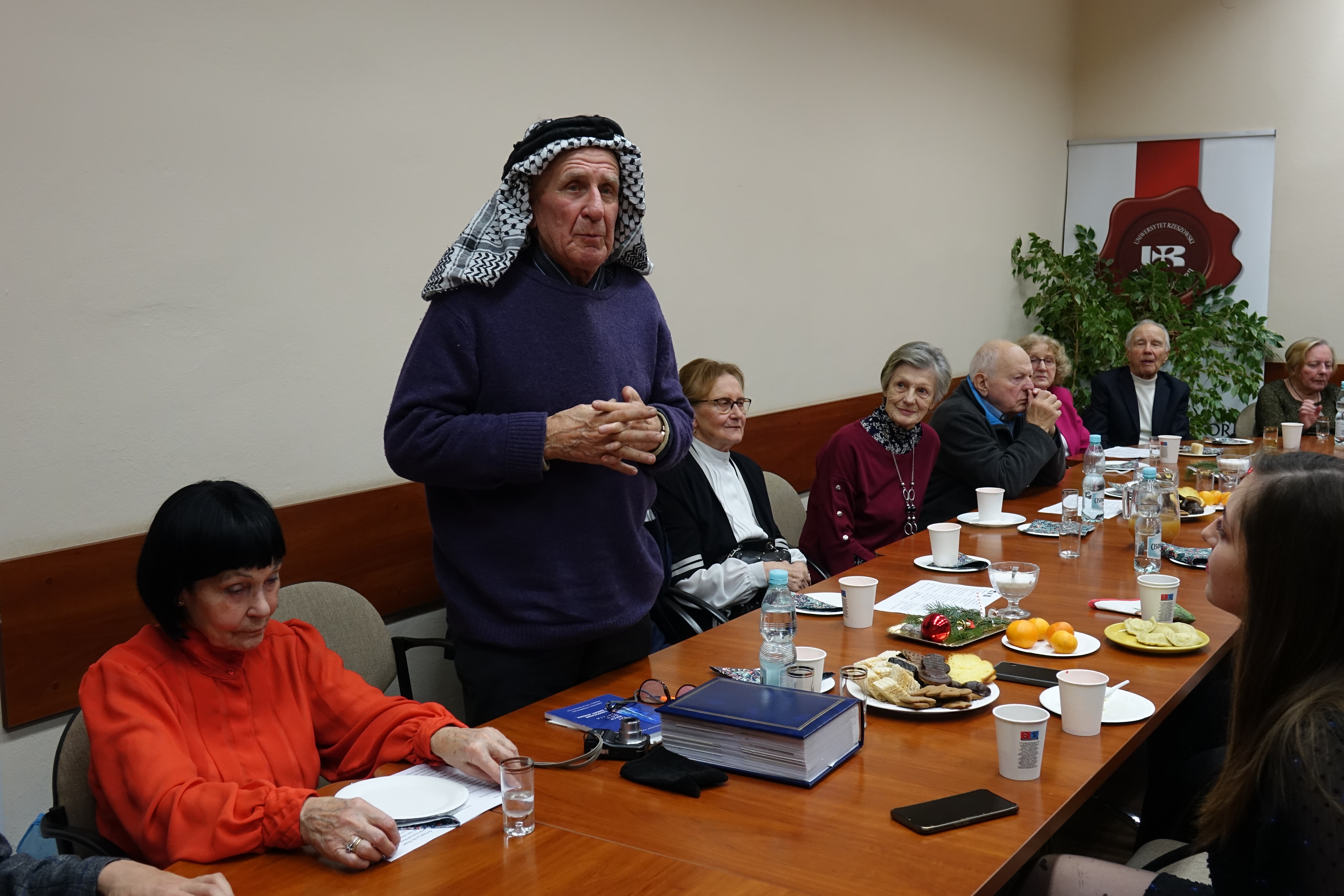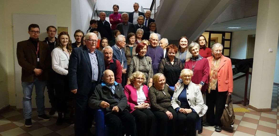 Po bardzo udanym spotkaniu wiosennym, członkowie Klubu Seniora 80+ spotkali się po raz kolejny, tym razem na terenie Uniwersytetu Rzeszowskiego przy ul. Rejtana. Uroczyste spotkanie świąteczne zorganizowano 16 grudnia 2022 r. w sali 226 budynku A-1. Mimo bardzo uciążliwych warunków pogodowych, frekwencja dopisała. Przybyło 25 osób – członków Klubu Seniora 80+, którzy na przywitanie otrzymywali "Biuletyn Nr 21-22" i „Głos Seniora”. Było też 10 słuchaczy UTW-UR zaangażowanych w organizację wydarzenia oraz 11 studentów z Instytutu Historii UR. Zebranych powitała Prezes Zarządu UTW-UR Małgorzata Siuta, która wyraziła radość z możliwości ponownego spotkania seniorów uczestniczących w wydarzeniach proponowanych przez Klub Seniora 80+ oraz złożyła obecnym serdeczne życzenia świąteczne i noworoczne. Potem prowadzenie spotkania przejęła Wiceprezes Zarządu UTW-UR Danuta Kamieniecka–Przywara. Zasługą organizatorów było zapewnienie ciepłego, świątecznego klimatu od pierwszych chwil spotkania. Zgodnie z wieloletnią tradycją spotkań Klubu Seniora 80+ obchodzono także urodziny – tym razem swoją „osiemdziesiątkę” świętowała i otrzymała drobny upominek kol. Halina Cisak, była koordynatorka sekcji języków obcych, która obecnie realizuje swoje pasje w klubie malarstwa i w klubie fotografii. Przy blasku lampek choinkowych rozpoczęto serwowanie tradycyjnego barszczu i pierożków, a w międzyczasie kolejni seniorzy prezentowali swoje pasje, podobnie jak to było na spotkaniu wiosennym. Duży aplauz wzbudził kol. Henryk Pelc, który w nakryciu głowy ze stroju Beduina opowiadał o swoim pobycie w Dubaju. Zachęcił także jedną ze studentek do nałożenia elementów egzotycznego damskiego stroju, co uchwycili koledzy fotografowie. Niestety, brak czasu nie pozwolił na zademonstrowanie tradycyjnego parzenia kawy z wykorzystaniem przyniesionych przez kol. Pelca akcesoriów. Swoje pasje zaprezentowała także kol. Maria Rudnicka, która zademonstrowała nie tylko swoje talenty poetyckie, ale także zaśpiewała po francusku popularną piosenkę. Dużą niespodzianką był udział studentów kulturoznawstwa, którzy przynieśli niezbędne rekwizyty i poprowadzili grę w BINGO. Gra cieszyła się dużym powodzeniem, a wygrał ją kol. Tadeusz Kunc. Nie brakło okazji do wspólnego zaśpiewania kolęd przy akompaniamencie gitary, którą na spotkanie przyniosła jedna ze studentek. Po deserze, na który złożyły się kawa, herbata, pyszny sernik, owoce i kruche ciasteczka, każdy z  seniorów otrzymał na pożegnanie tabliczkę czekolady. Nie było końca podziękowaniom i wyrazom wdzięczności za tak miłą uroczystość oraz skierowano prośby o zorganizowanie kolejnych podobnych spotkań. Na  zakończenie wiceprezes Danuta Kamieniecka–Przywara podziękowała organizatorom, studentom i członkom Klubu 80+ oraz złożyła życzenia zdrowych, spokojnych, radosnych Świąt Bożego Narodzenia oraz wszystkiego najlepszego w Nowym Roku. W finale wszyscy obecni zapozowali do wspólnego zdjęcia.