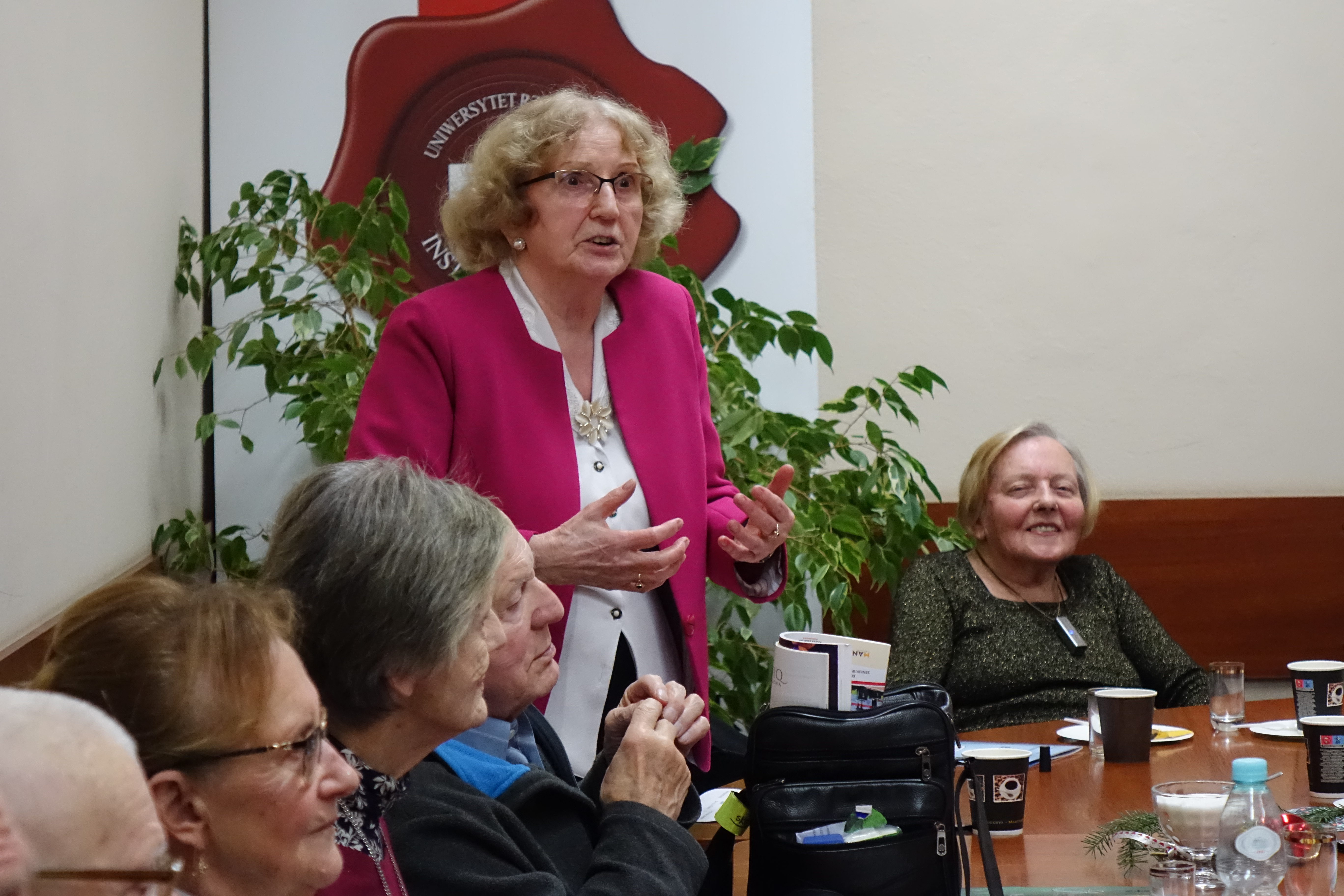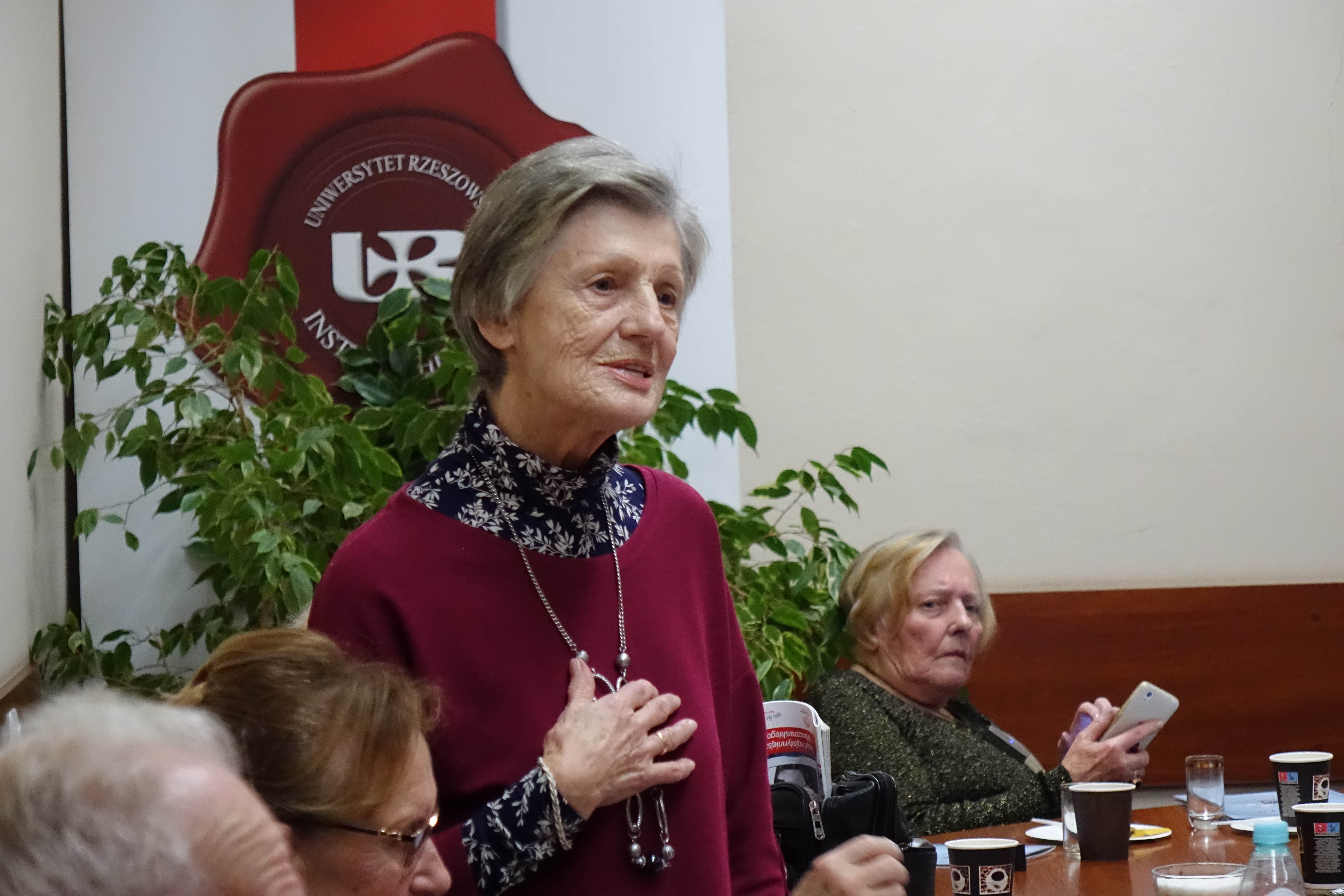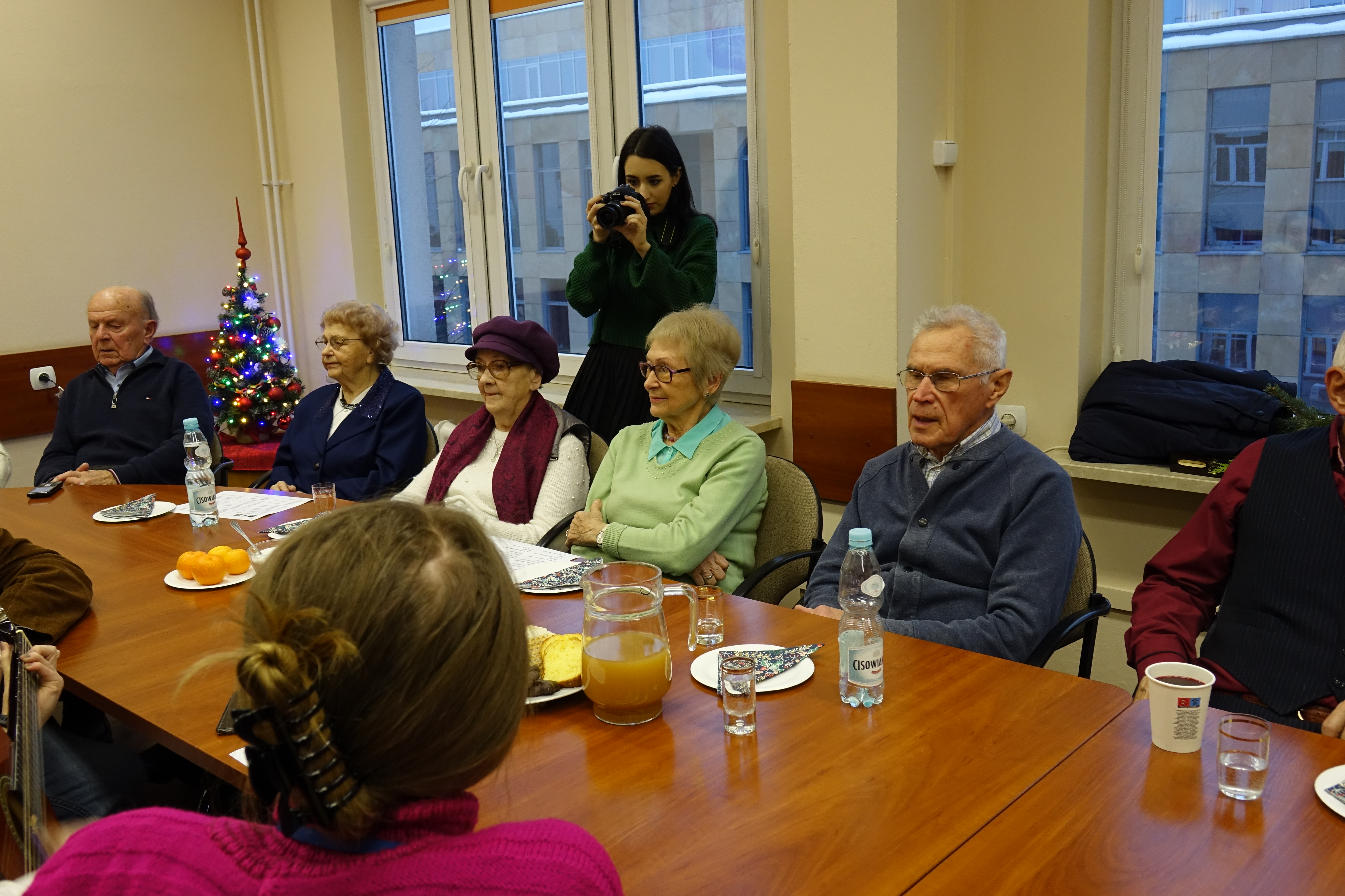 Po bardzo udanym spotkaniu wiosennym, członkowie Klubu Seniora 80+ spotkali się po raz kolejny, tym razem na terenie Uniwersytetu Rzeszowskiego przy ul. Rejtana. Uroczyste spotkanie świąteczne zorganizowano 16 grudnia 2022 r. w sali 226 budynku A-1. Mimo bardzo uciążliwych warunków pogodowych, frekwencja dopisała. Przybyło 25 osób – członków Klubu Seniora 80+, którzy na przywitanie otrzymywali "Biuletyn Nr 21-22" i „Głos Seniora”. Było też 10 słuchaczy UTW-UR zaangażowanych w organizację wydarzenia oraz 11 studentów z Instytutu Historii UR. Zebranych powitała Prezes Zarządu UTW-UR Małgorzata Siuta, która wyraziła radość z możliwości ponownego spotkania seniorów uczestniczących w wydarzeniach proponowanych przez Klub Seniora 80+ oraz złożyła obecnym serdeczne życzenia świąteczne i noworoczne. Potem prowadzenie spotkania przejęła Wiceprezes Zarządu UTW-UR Danuta Kamieniecka–Przywara. Zasługą organizatorów było zapewnienie ciepłego, świątecznego klimatu od pierwszych chwil spotkania. Zgodnie z wieloletnią tradycją spotkań Klubu Seniora 80+ obchodzono także urodziny – tym razem swoją „osiemdziesiątkę” świętowała i otrzymała drobny upominek kol. Halina Cisak, była koordynatorka sekcji języków obcych, która obecnie realizuje swoje pasje w klubie malarstwa i w klubie fotografii. Przy blasku lampek choinkowych rozpoczęto serwowanie tradycyjnego barszczu i pierożków, a w międzyczasie kolejni seniorzy prezentowali swoje pasje, podobnie jak to było na spotkaniu wiosennym. Duży aplauz wzbudził kol. Henryk Pelc, który w nakryciu głowy ze stroju Beduina opowiadał o swoim pobycie w Dubaju. Zachęcił także jedną ze studentek do nałożenia elementów egzotycznego damskiego stroju, co uchwycili koledzy fotografowie. Niestety, brak czasu nie pozwolił na zademonstrowanie tradycyjnego parzenia kawy z wykorzystaniem przyniesionych przez kol. Pelca akcesoriów. Swoje pasje zaprezentowała także kol. Maria Rudnicka, która zademonstrowała nie tylko swoje talenty poetyckie, ale także zaśpiewała po francusku popularną piosenkę. Dużą niespodzianką był udział studentów kulturoznawstwa, którzy przynieśli niezbędne rekwizyty i poprowadzili grę w BINGO. Gra cieszyła się dużym powodzeniem, a wygrał ją kol. Tadeusz Kunc. Nie brakło okazji do wspólnego zaśpiewania kolęd przy akompaniamencie gitary, którą na spotkanie przyniosła jedna ze studentek. Po deserze, na który złożyły się kawa, herbata, pyszny sernik, owoce i kruche ciasteczka, każdy z  seniorów otrzymał na pożegnanie tabliczkę czekolady. Nie było końca podziękowaniom i wyrazom wdzięczności za tak miłą uroczystość oraz skierowano prośby o zorganizowanie kolejnych podobnych spotkań. Na  zakończenie wiceprezes Danuta Kamieniecka–Przywara podziękowała organizatorom, studentom i członkom Klubu 80+ oraz złożyła życzenia zdrowych, spokojnych, radosnych Świąt Bożego Narodzenia oraz wszystkiego najlepszego w Nowym Roku. W finale wszyscy obecni zapozowali do wspólnego zdjęcia.
