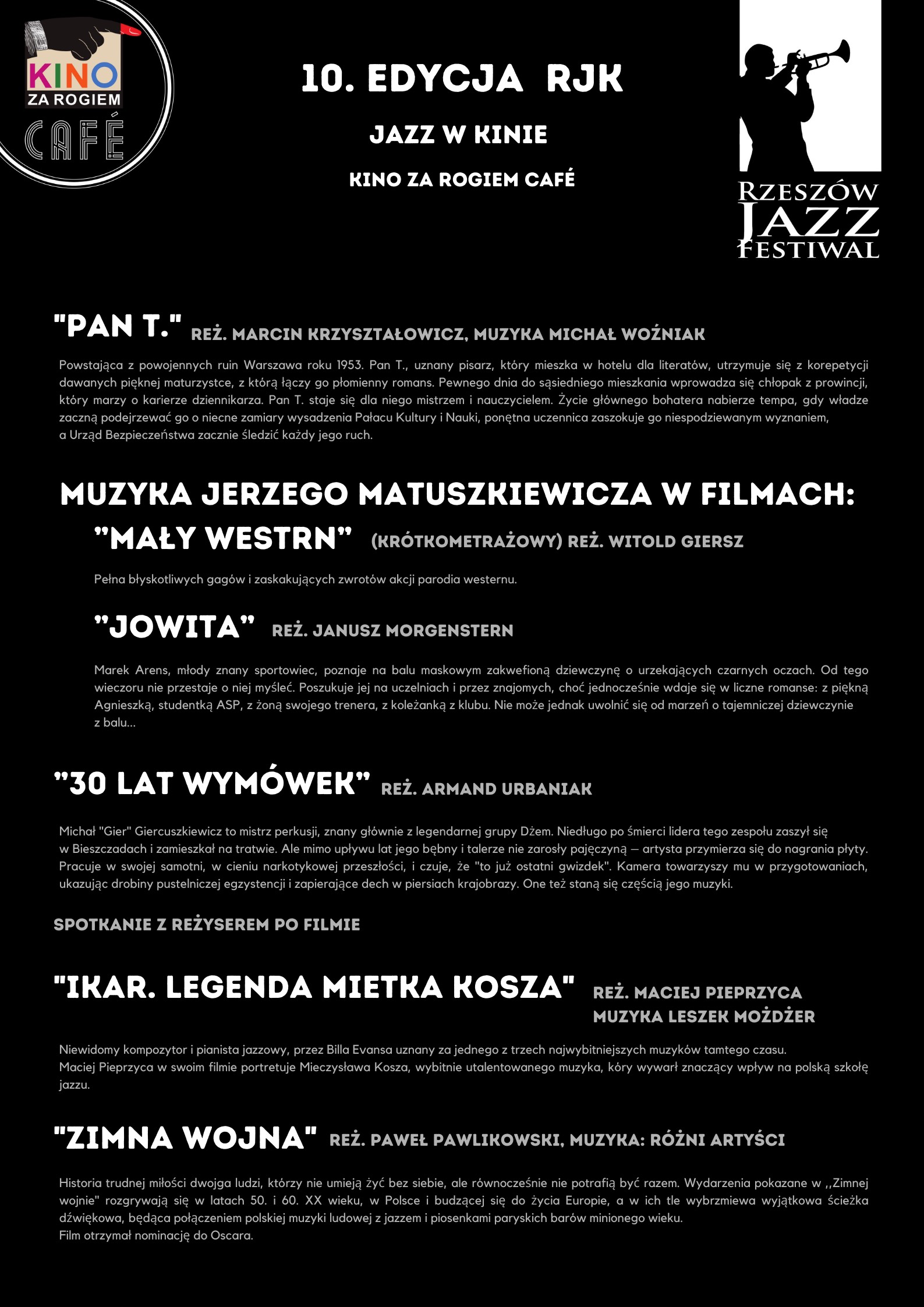 Z radością informujemy, że Kino za Rogiem Cafe zostało jednym z partnerów Rzeszów Jazz Festiwal - największego festiwalu jazzowego na Podkarpaciu - co oznacza, że w listopadzie w naszym wątkowym miejscu odbędą się zarówno koncerty, jak i pokazy filmowe poświęcone tej tematyce.