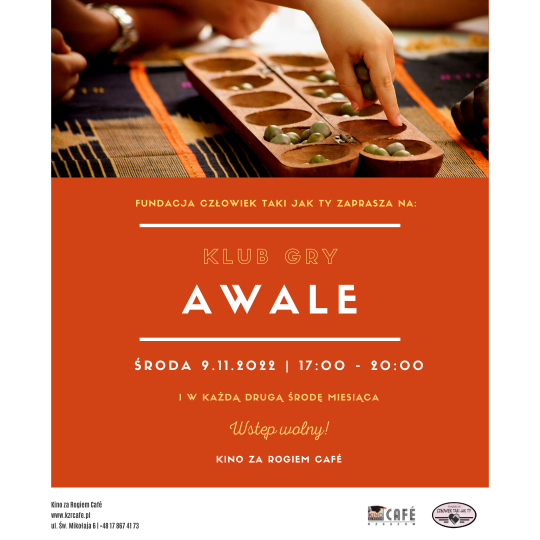 Awale, zwana również Oware, Wari,Kalaha czyli Mankala to jedna z najstarszych rozrywek świata. Gry z rodziny mankala są znane w Afryce od czasów neolitu, przez co uważane są za typowo afrykańskie. Na przestrzeni dziejów każde plemię miało z tą grą styczność, a w wielu przypadkach uważano ją za świętość. Nikt dokładnie nie potrafi określić wieku gry, ale wiadomo, że sięga ona kilku tysięcy lat. Klub graczy #Awale jest jednym z wielu filarów działalności fundacji Człowiek taki jak TY, która ma na celu rozpowszechnianie kultury afrykańskiej i zrzeszanie jej sympatyków. Podczas spotkań w Kinie za Rogiem Cafe będzie można poznać zasady gry i zagrać w nią, posłuchać afrykańskiej muzyki, porozmawiać o Afryce, jak i zamówić afrykańskie danie.