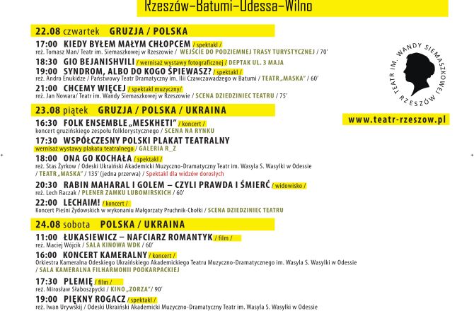 Teatr im.Wandy Siemaszkowej wystawi spektakle muzyczne- ''Kiedy byłem małym chłopcem'' ( o początkach kariery Tadeusza Nalepy) oraz ''Chcemy więcej" ( usłyszymy największe przeboje polskiej sceny muzycznej w znakomitych kreacjach aktorskich; na scenie aktorzy rzeszowskiego Teatru: Dagny Cipora,Mariola Łabno-Flaumenhaft, Michał Chołka i Robert Żurek); Teatr z gruzińskiego Batumi zaprezentuje spektakl " Syndrom, albo do kogo śpiewasz?"; Goście z Ukrainy pokażą nam dwa spektakle: "Ona go kochała" i